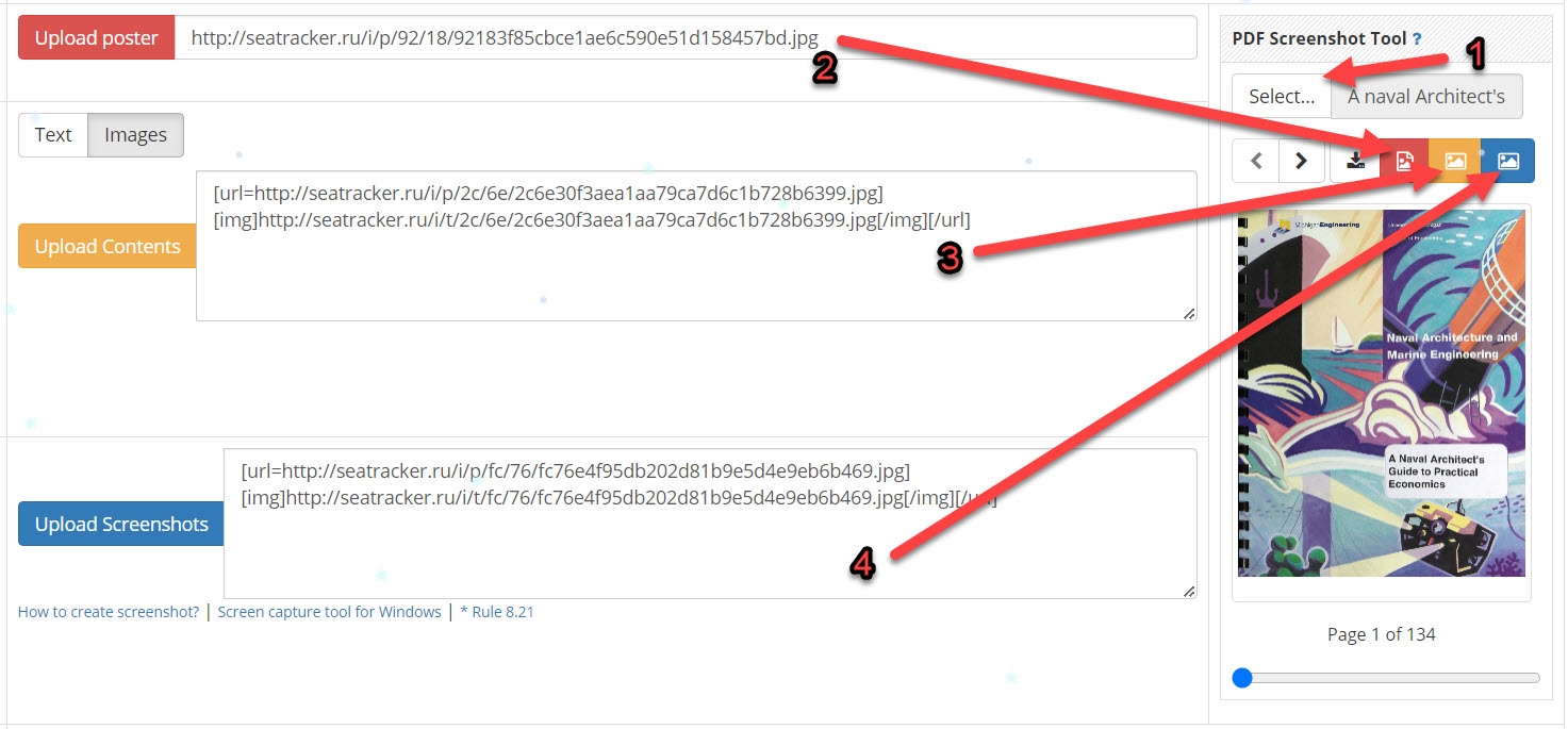 !PDF/DJVU/EPUB ONLY. The most convenient and fastest way to create screenshots is using our built-in Screenshot Tool. You can find this tool on the release creation page and it looks like:  How to use? 1. Select document 2. Create a screenshot using red button, it will automatically be inserted into the Poster field 3. Create a screenshot using orange button, it will be automatically inserted into the Contents field 4. Create a screenshot using blue button, it will be automatically inserted into the Screenshot field