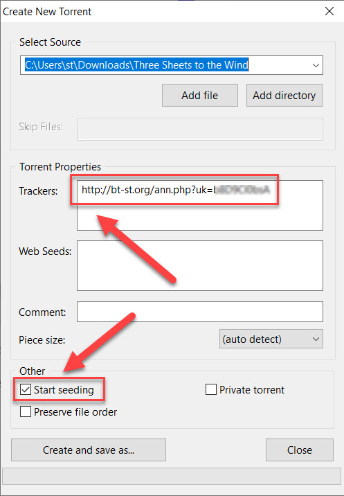 Torrent settings: Exclude - used when creating a multi-file torrent to exclude unnecessary files / folders. To do this, enter the name of the excluded file / folder in the field and, if there are several of them, enter it, separating the names with a vertical line | Trackers - leave blank or you can add a record of our tracker: http://bt-st.org/ann.php?uk=PASSKEY http://seatracker.info/bt/announce.php?uk=PASSKEY You can find PASSKEY value in your profile. Trackers are automatically registered in the torrent file after you have uploaded it to the site and downloaded it again to your client. Part size - in most cases nothing needs to be changed here, uTorrent automatically determines the optimal part (block) size based on the volume of the entire torrent. But if we want to reduce the size of the torrent file (the tracker has restrictions on its size), you can specify the maximum allowable size of 15mb. Private torrent - this parameter prohibits downloading via DHT check if you set a download limit by reputation. Web seed - leave blank. Start seeding - check. When you set it, the torrent will automatically start immediately after the completion of the torrent creation, and if you specified the tracker correctly, the torrent will turn green. However, in order to take statistics into account, it must first be registered on the tracker. Now we press the button "Create and save in ..."