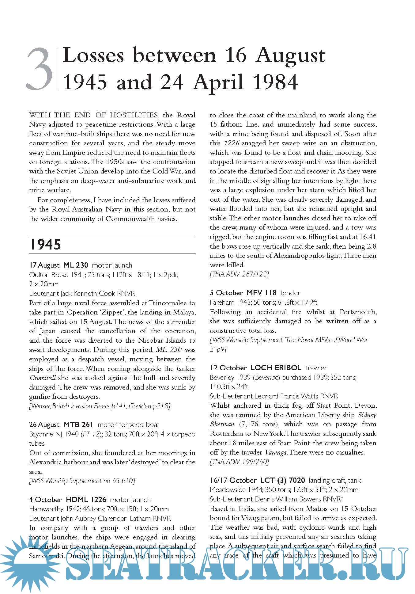 Year: 2022 Language: english Author: David Heppe Genre: History Publisher: Naval Institute Press Edition: May 15, 2022 ISBN: 9781399097666 Format: PDF Quality: eBook Pages count: 450 Description: The core of the book is taken up by those losses experienced during World WarII, but peacetime losses and more recent conflicts such as the Falklands War of 1982 are included. Arranged chronologically, every entry notes the outline details of the vessel, identifies the Commanding Officer, where known, and gives a full and often harrowing account of the circumstances of the loss and the number of casualties. The details come from extensive original research using primary source material wherever possible. This comprehensive record of warship losses, from all causes, suffered by the Royal Navy over the past one hundred years, is the first single-volume work on the subject and represents a major milestone in naval research and publishing.