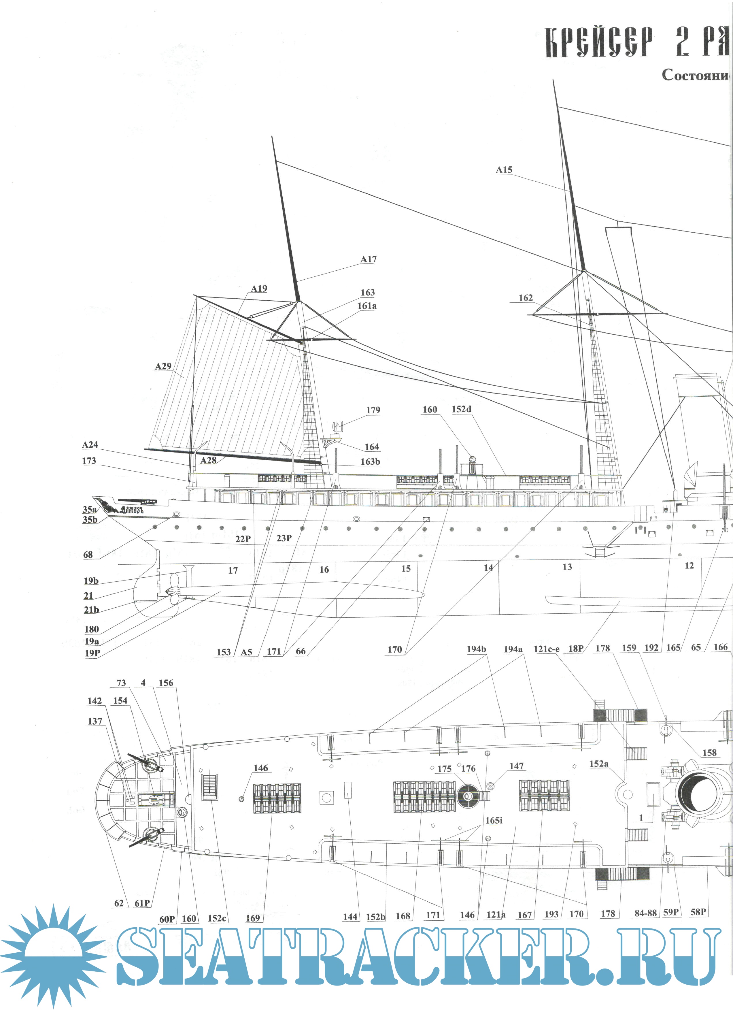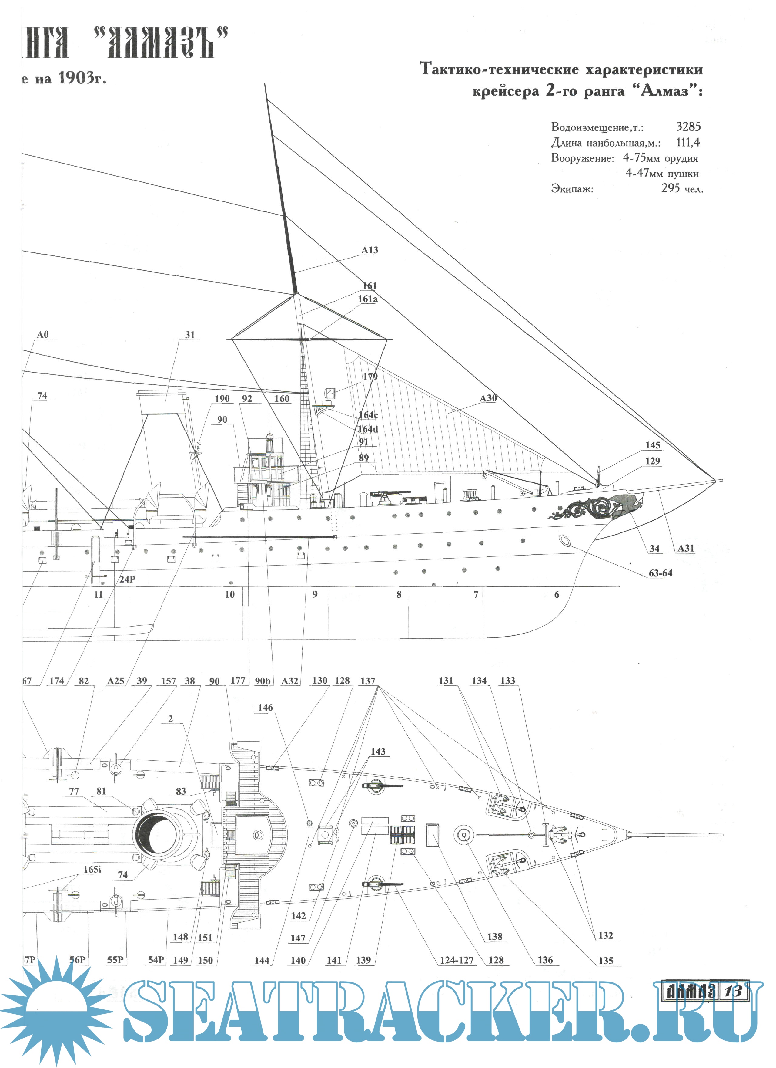 Описание: 27 листов цветных выкроек и инструкций для изготовления бумажно модели крейсера 2-го ранга "Алмаз" по состоянию на 1903 год в масштабе 1:200