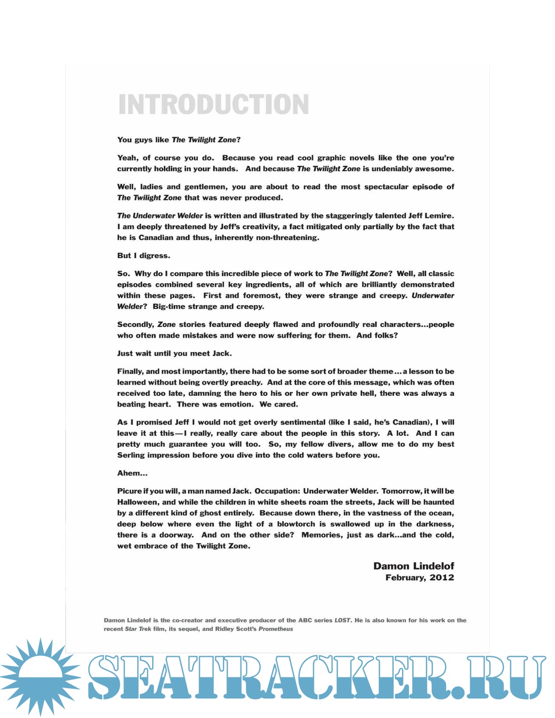 Year: 2012 Language: English Author: Jeff Lemire Publisher: Top Shelf Productions Edition: Kindle Format: PDF Quality: eBook Pages count: 249 Description: Pressure. As an underwater welder on an oilrig off the coast of Nova Scotia, Jack Joseph is used to the immense pressures of deep-sea work. Nothing, however, could prepare him for the pressures of impending fatherhood. As Jack dives deeper and deeper, he seems to pull further and further away from his young wife, and their unborn son. But then, something happens deep on the ocean floor. Jack has a strange and mind-bending encounter that will change the course of his life forever. ... Equal parts blue-collar character study and mind-bending science fiction epic, The Underwater Welder is a 250-page graphic novel that explores fathers and sons, birth and death, memory and truth, and treasures we all bury deep down inside.
