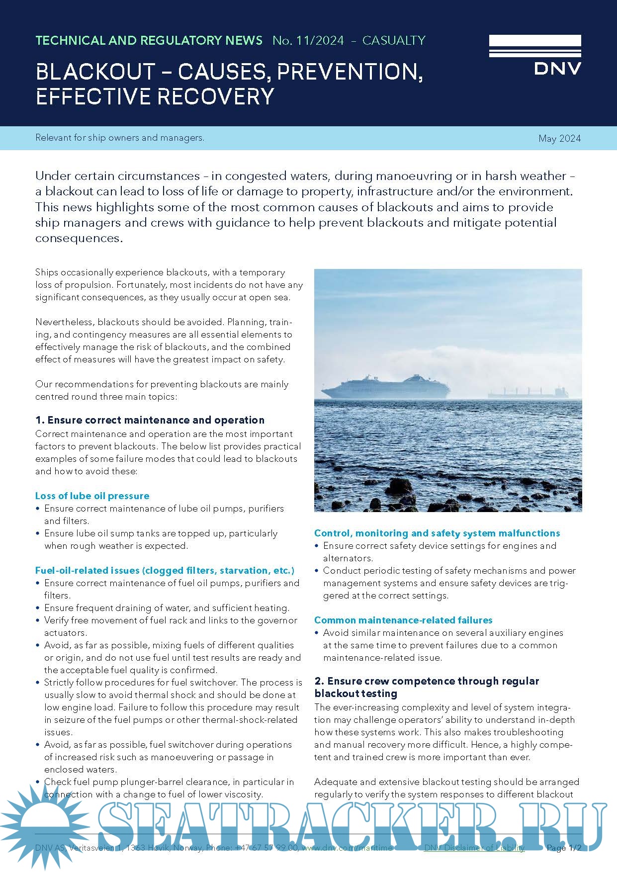 Year: 2024 Language: English Author: DNV Genre: Other Edition: no. 11/2024 May 2024 Format: PDF Quality: eBook Pages count: 3 Description: Technical and Regulatory News – Casualty. Relevant for ship owners and managers. Under certain circumstances – in congested waters, during manoeuvring or in harsh weather – a blackout can lead to loss of life or damage to property, infrastructure and/or the environment. This news highlights some of the most common causes of blackouts and aims to provide ship managers and crews with guidance to help prevent blackouts and mitigate potential consequences. Recommendations for preventing blackouts are mainly centred round three main topics: 1. Ensure correct maintenance and operation 2. Ensure crew competence through regular blackout testing 3. Prepare and implement operating procedures for identified high-risk operations Additional info: