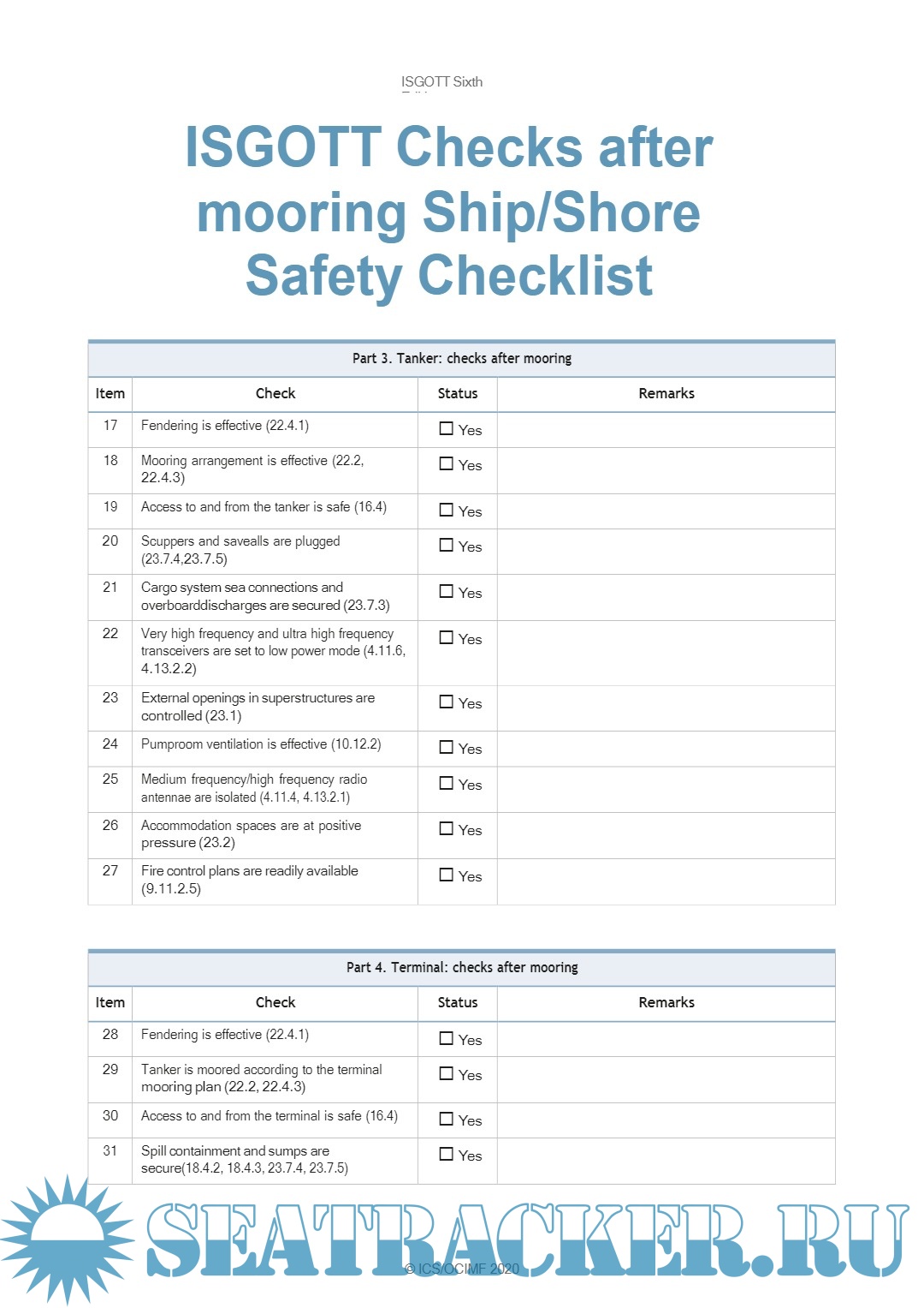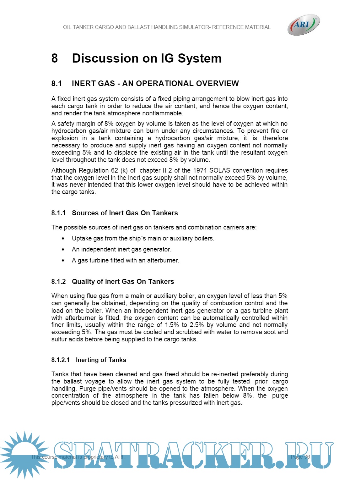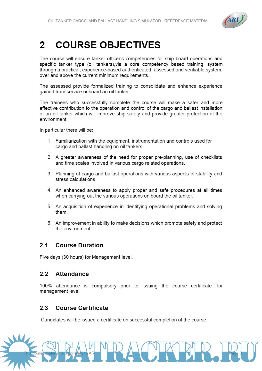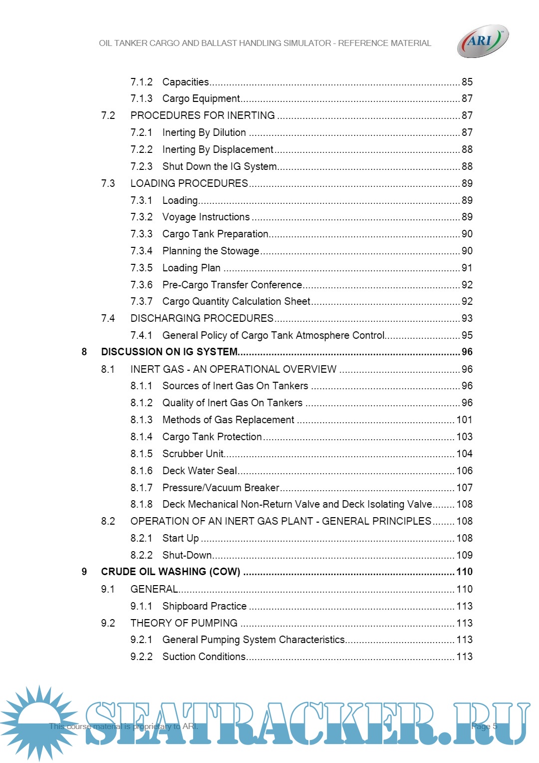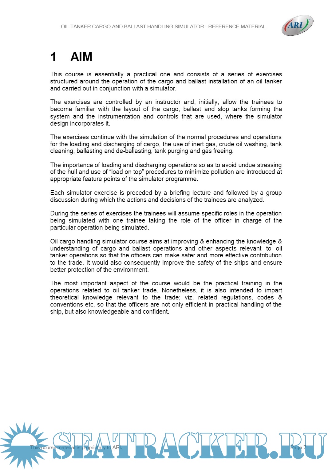 Year: 2022 Language: English Author: ARI Publisher: Applied Research International, New Delhi - India Format: PDF Quality: eBook Pages count: 130 Description: This course is essentially a practical one and consists of a series of exercises structured around the operation of the cargo and ballast installation of an oil tanker and carried out in conjunction with a simulator. Oil cargo handling simulator course aims at improving & enhancing the knowledge & understanding of cargo and ballast operations and other aspects relevant to oil tanker operations so that the officers can make safer and more effective contribution to the trade. It would also consequently improve the safety of the ships and ensure better protection of the environment. The most important aspect of the course would be the practical training in the operations related to oil tanker trade. Nonetheless, it is also intended to impart theoretical knowledge relevant to the trade; viz. related regulations, codes & conventions etc, so that the officers are not only efficient in practical handling of the ship, but also knowledgeable and confident. The course will ensure tanker officer’s competencies for ship board operations and specific tanker type (oil tankers),via a core competency based training system through a practical, experience-based authenticated, assessed and verifiable system, over and above the current minimum requirements.