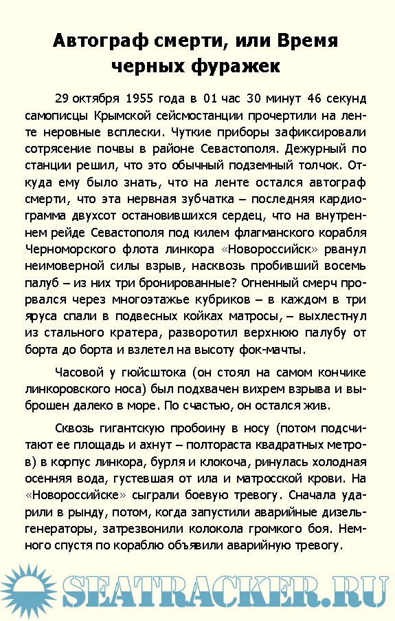 Описание: В Северной бухте Севастополя 29 октября 1955 года произошла одна из самых тяжелых морских трагедий русского флота - затонул флагман Черноморской эскадры линкор «Новороссийск».