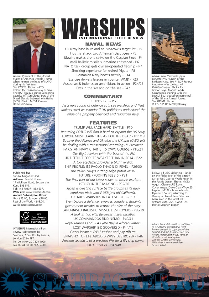 Description: Warships IFR puts the spotlight on the latest developments in the world’s navies. It covers current defence issues and has comments by leading analysts. The magazine regularly includes features on the Royal Navy and the US Navy in addition to incorporating news and features on all other navies across the globe. Warships IFR frequently carries in-depth articles on naval heritage.WARSHIPS International Fleet Review is published 12 times a year by Tandy Media Ltd who also publish Shipping Today & Yesterday (which provides news and features from the world of merchant shipping).
