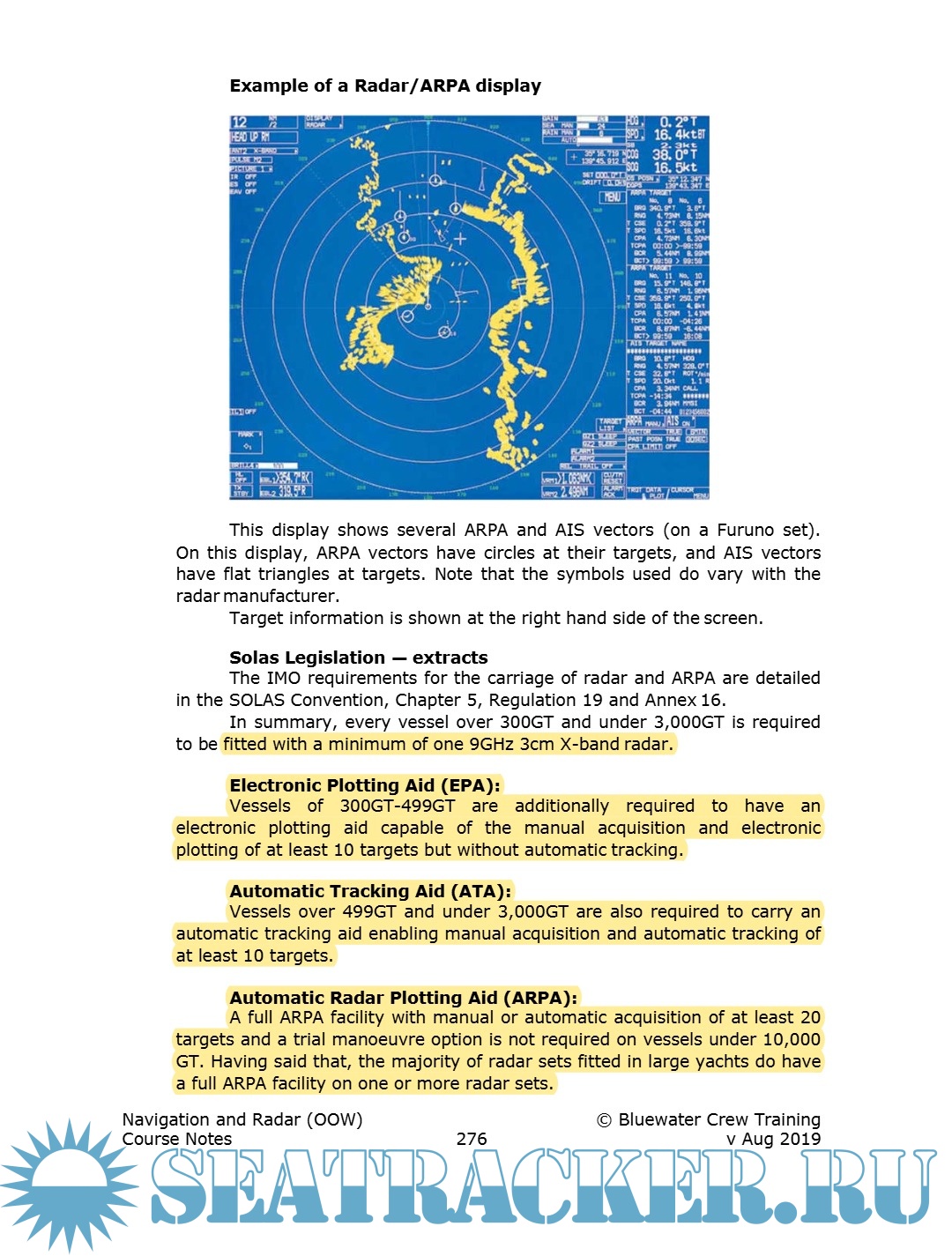 Year: 2019 Language: English Author: Bluewater Yachting Publisher: Bluewater Crew Training Format: PDF Quality: eBook Pages count: 286 Description: These notes form a part of a programme of study leading to command qualifications of large commercially and privately operated yachts, in accordance with the UK Maritime and Coastguard Agency (MCA) syllabus for Master (Yachts). This publication is a training aid - under no circumstances should it be used as legal advice or justification for any action. Readers must base any decisions for action upon current UK and International legislation and regulations. The publishers disclaim any liability for any loss or damage caused by any errors or omissions. This book is intended to assist those studying for the ten day Officer of the Watch, Navigation and Radar course and exam, a module in the Certificate of Competency for the Officer of the Watch of large commercial yachts issued under the Commercial Code for large yachts. The module will consist of sections on the Collision Regulations, Chart work, Buoyage, Electronic navigation aids, ECDIS, AIS, Radar and ARPA. The first 10 days will be theory leading to an IAMI written examination, and then 5 days each for a generic ECDIS course and a Bridge Watchkeeping course carried out on an approved simulator. The ECDIS and Watchkeeping courses need not be taken directly after the theory course. This module will be conducted over a minimum period of 20 days. This module requires assessment on an approved Radar Simulator and live electronic Navigational Equipment and includes navigational exercises in the use of radar and navigational aids on a simulated ship’s bridge. All participants MUST have successfully completed their Yachtmaster Course and have a good knowledge of the IRPCS, basic chartwork and navigational skills prior to taking this class. Bluewater Yachting (Antibes, France ; Ft. Lauderdale, FL). 2018