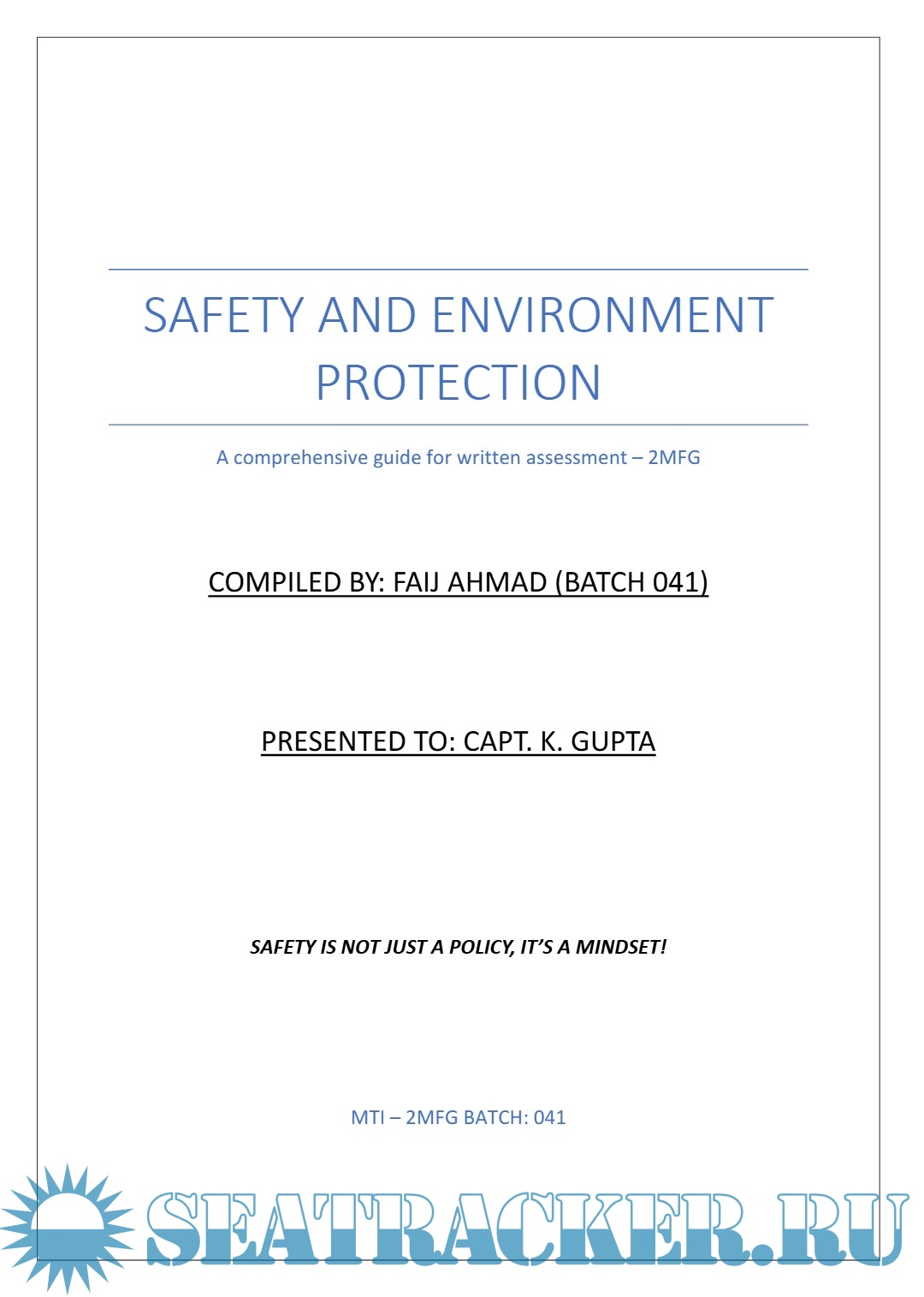 Description: These notes on Safety and Environment Protection have been compiled and presented by Faij Ahmad, as encouraged by Captain K. Gupta Sir. The contents include classroom dictations, personal interpretations, and additional researched material intended to support academic learning and preparation for the Second Mate (FG) Examination.