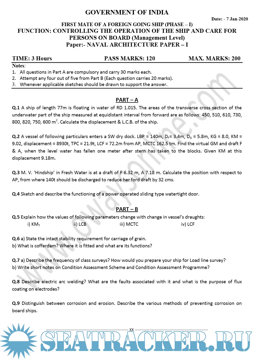Description: Question paper set for Naval Architecture-I Mercantile Marine Department (MMD), India Exams for Phase I - Chief Mate (F.G.).