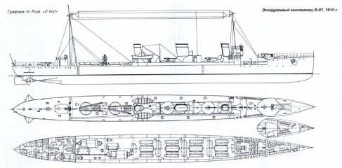 К началу Первой мировой войны, в которой Россия и Германия оказались в разных воюющих лагерях, ни один из машинокомплектов, находившихся в высокой степени готовности, не был поставлен заказчику. В первых числах августа 1914 года руководство фирм “Блом унд Фосс” и “Вулкан” обратилось в Имперское военно-морское управление (Reichmarineamt - RMA) с предложением построить по два больших миноносца на основе имевшихся готовых деталей корпусов и механизмов, заказанных им русским флотом. Они должны были иметь нормальное водоизмещение 1350 тонн, скорость 36 узлов и вооружаться четырьмя 88-мм пушками и шестью 500-мм торпедными аппаратами.