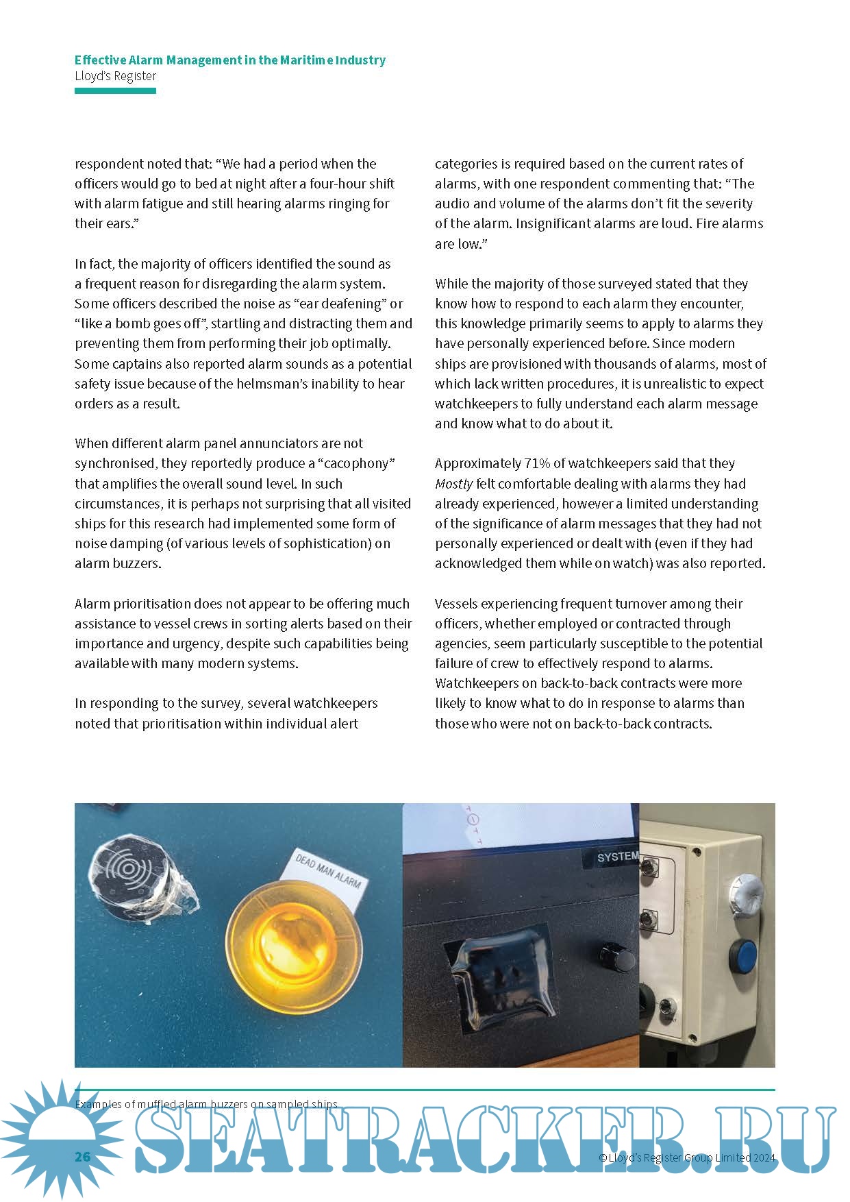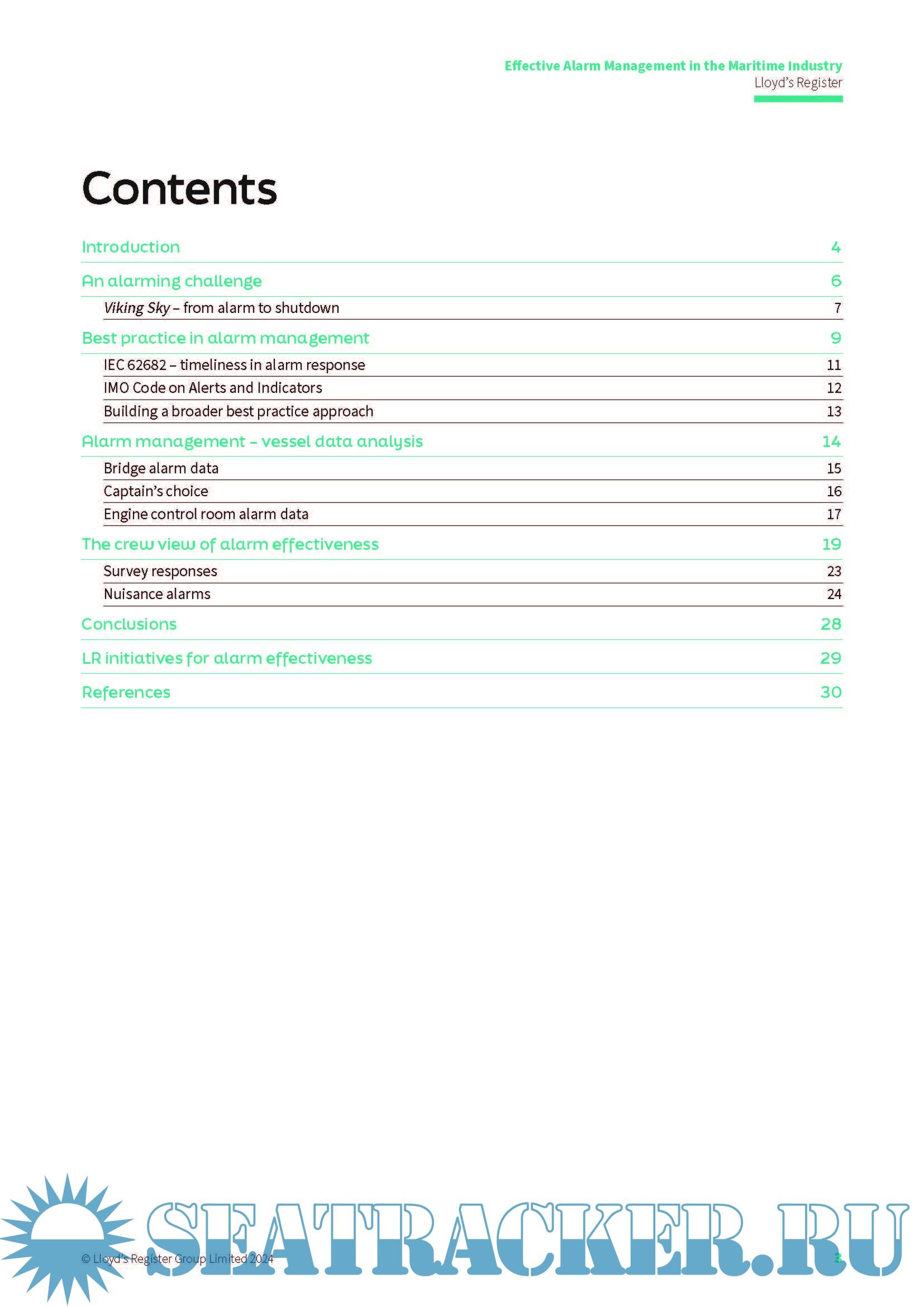 Year: 2024 Language: English Author: Lloyd’s Register Genre: Textbook Edition: September 2024 Format: PDF Quality: eBook Pages count: 32 Description: Watchfulness - the state of being constantly attentive and responsive to signs of opportunity, activity, or danger! This paper attempts to investigate the effectiveness of the alarm management processes currently applied in real world situations in the maritime industry, through the analysis of operational bridge alarm data and the collection of detailed crew opinions and responses to alarm management via a comprehensive survey. This study provides an initial exploration of the challenges of operating effective alarm systems on ships, based on the experiences of 65 serving watchkeepers combined with data observed and collected from vessel bridges and engine control rooms during actual operations.