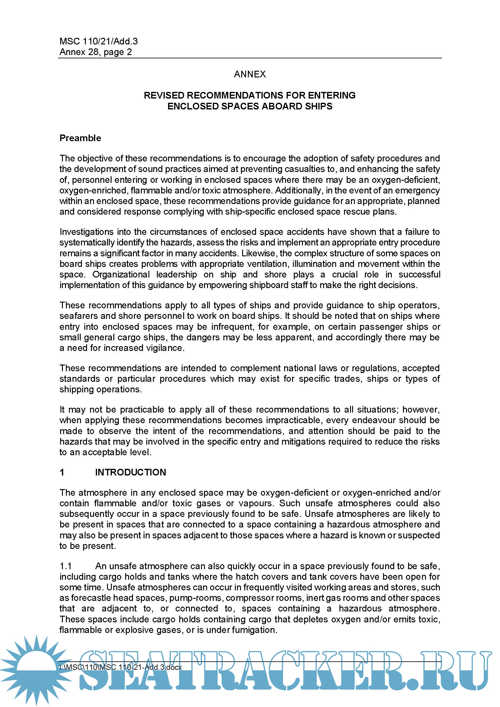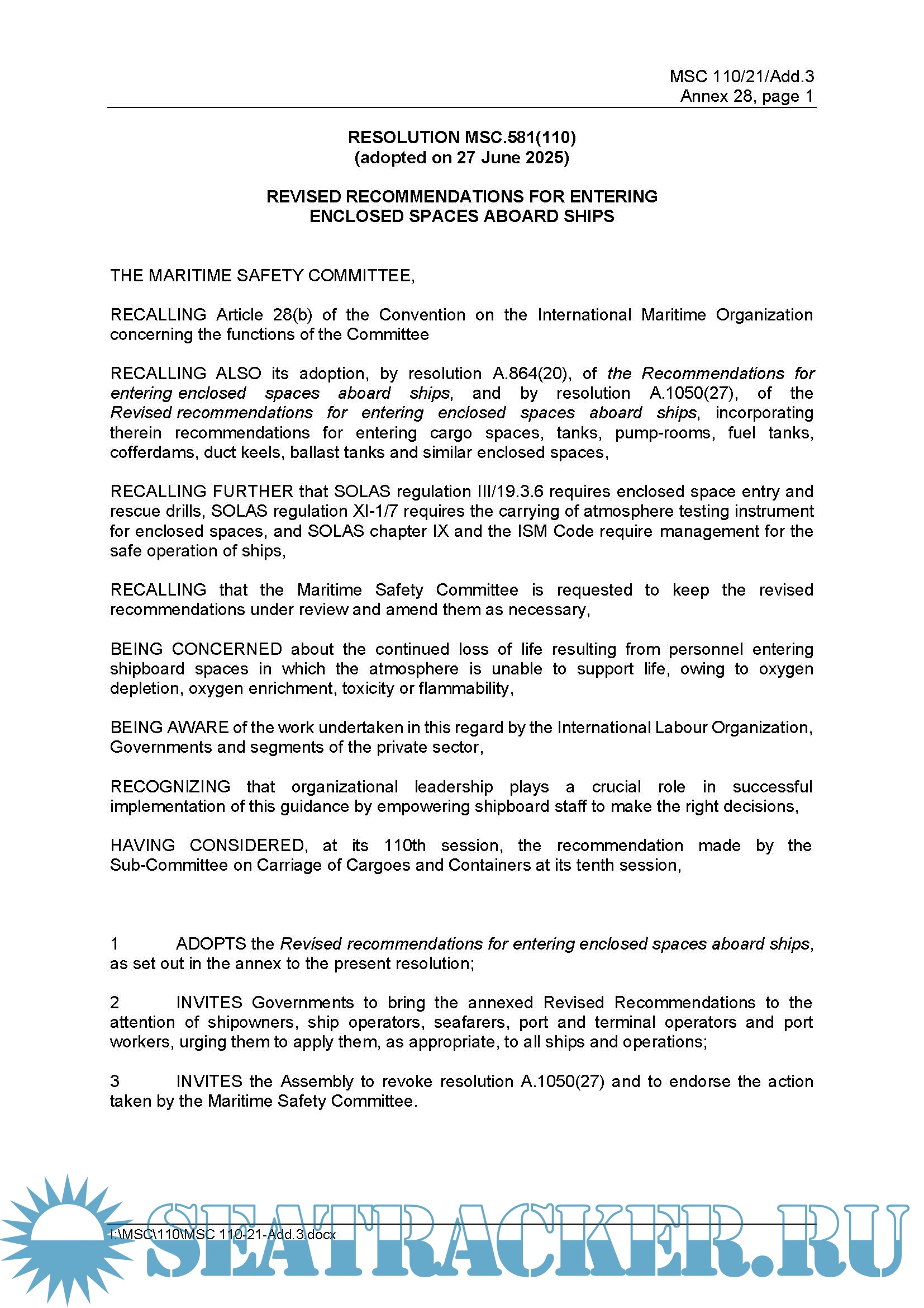 Description: RESOLUTION MSC.581(110) (adopted on 27 June 2025) The objective of these recommendations is to encourage the adoption of safety procedures and the development of sound practices aimed at preventing casualties to, and enhancing the safety of, personnel entering or working in enclosed spaces where there may be an oxygen-deficient, oxygen-enriched, flammable and/or toxic atmosphere. Additionally, in the event of an emergency within an enclosed space, these recommendations provide guidance for an appropriate, planned and considered response complying with ship-specific enclosed space rescue plans.