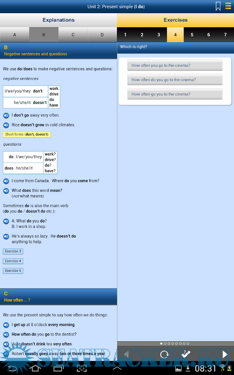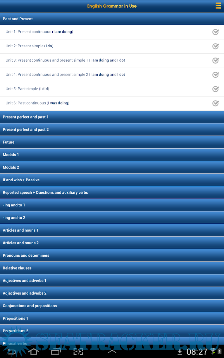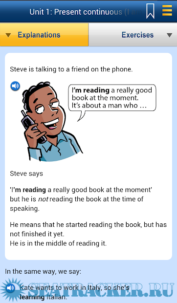 Year: 2020 Developer: Cambridge Learning Platform: Android 64-bit OS compatibility: unknown System Requirements: Requires Android 5.1+ Version: 1.11.40 (03.11.2020) Localization: english Crack: Not needed Description: The official English Grammar in Use app, written by Raymond Murphy. The only grammar app an intermediate learner of English will ever need. This Starter Pack includes six grammar units (Present and Past tenses) with clear explanations and interactive exercises, a Glossary of grammar words, and a Study Guide to help you decide which grammar units you need to study. WORLD’S BEST-SELLER Raymond Murphy’s English Grammar in Use is the world’s best-selling grammar book for intermediate learners of English, published by Cambridge University Press. The app contains clear presentation of grammar points together with interactive exercises to help you practise and improve. After downloading the Starter Pack you can buy all 145 grammar units or just the units you need. ANYTIME, ANYWHERE The grammar explanations and exercises have been written by Raymond Murphy specially for smartphones and tablets, making it easier to study grammar anytime, anywhere. AUTOMATIC MARKING Answers to the grammar activities are marked automatically and allow you to reveal the correct answer when you make a mistake. Perfect for self-study. LISTEN TO EXAMPLES Audio recordings of the example sentences help you to improve your listening skills, at the same time as improving your grammar. :