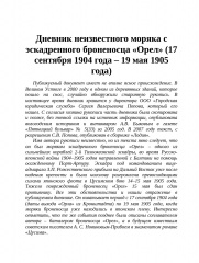 Описание: В сборнике документов публикуются рапорты, записки, дневники, личные письма и воспоминания офицеров и нижних чинов эскадренного броненосца «Орел», участвовавших в походе в составе 2-й Тихоокеанской эскадры на Дальний Восток и в Цусимском сражении в мае 1905 года. Для широкого круга читателей, интересующихся историей Российского флота.