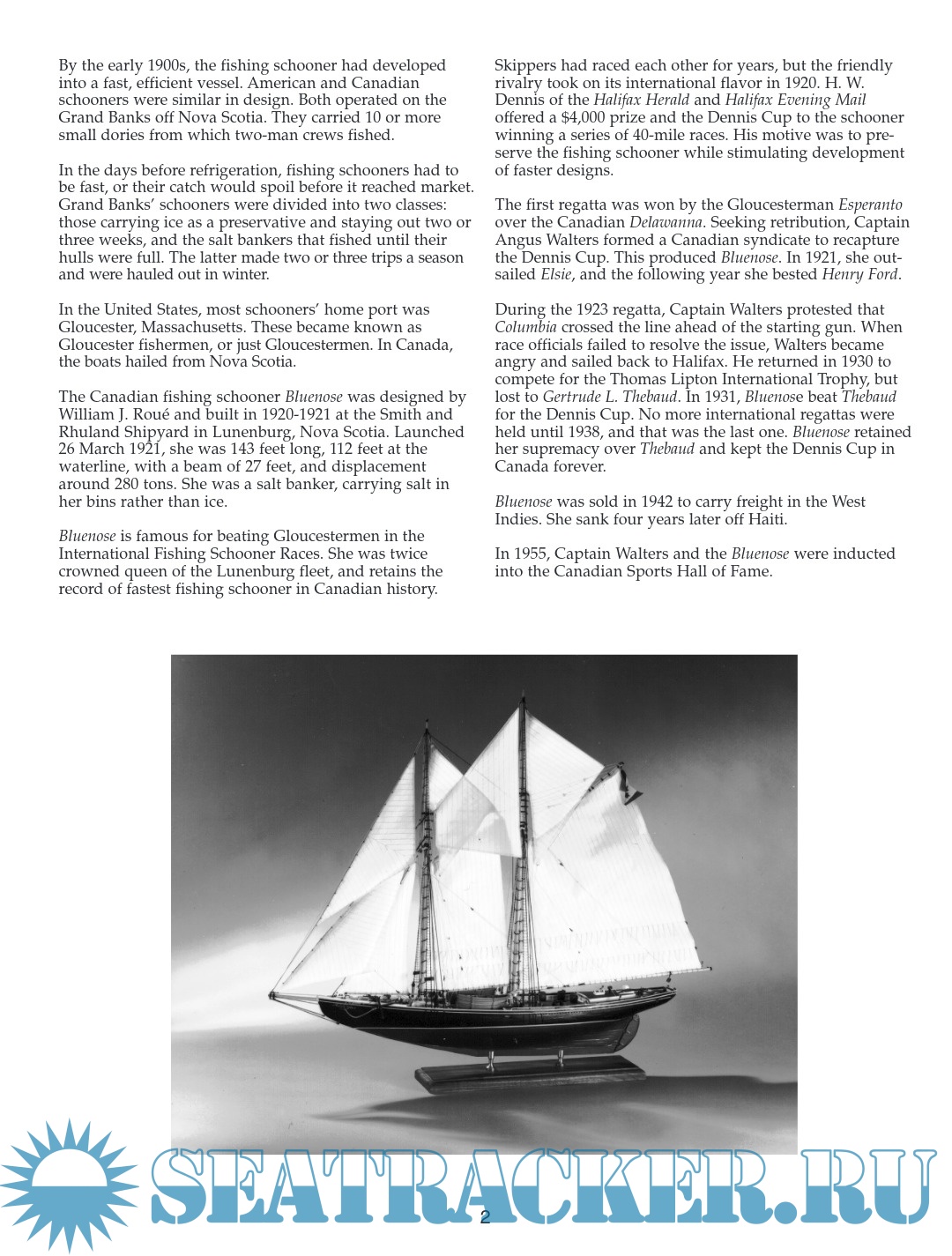 Year: 1997 Language: English Author: Evans B. Genre: Manual Publisher: Model Shipways Format: PDF Quality: eBook Pages count: 44 Description: Experience the rich history of the iconic Bluenose fishing schooner with this meticulously crafted 1:64 scale model kit from Model Expo. This authentic representation, featuring plank-on-bulkhead construction with laser-cut basswood parts, allows you to build a true-to-life replica of the legendary vessel that once ruled the rough waters off Newfoundland. The kit includes flexible basswood strips for hull planking, wooden blocks and deadeyes, brass fittings, and Britannia metal details, ensuring an impressive and accurate model. With three diameters of rigging line and cotton sailcloth included, your completed model will stand at an impressive 26.5 inches tall and 32 inches in length, making it a stunning addition to any nautical enthusiast's collection. Detailed instructions and a parts list are included to guide you through the build process. This classic model ship kit is perfect for adult hobbyists seeking an engaging and rewarding build experience.