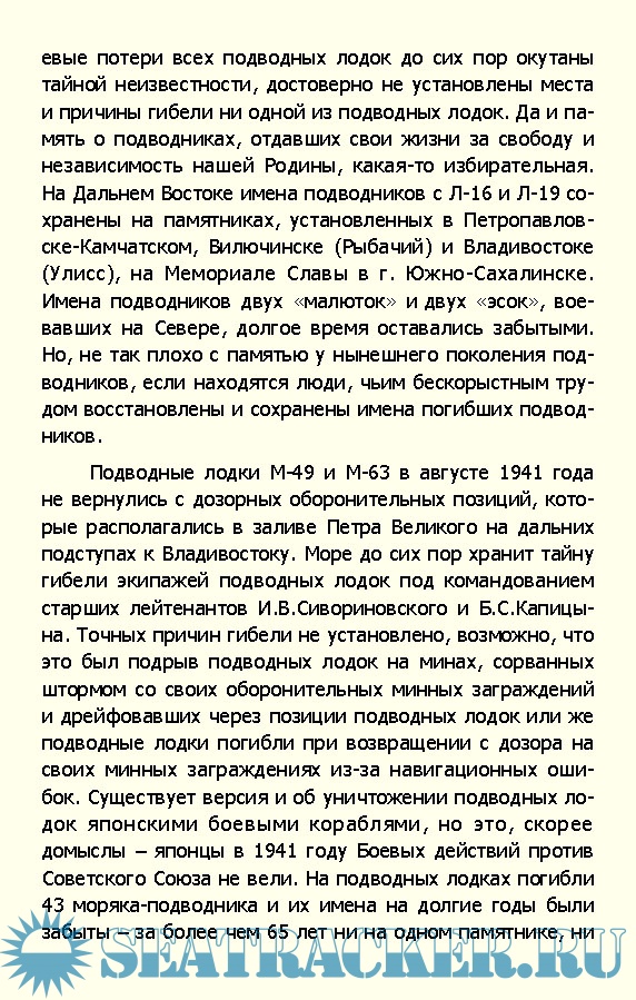 Описание: Долгое время о погибших подводных лодках и подводниках либо упоминалось вскользь, либо не говорилось вообще. До сих пор не известны широкой общественности подвиги этих героев мирного времени. На страницах книги приводятся данные по авариям, которые привели к гибели подводных лодок и гибели подводников ТОФ. Указаны случаи как аварийного, так и боевого характера. Приведенные данные не претендуют на полноту и абсолютную достоверность, поскольку получены из анализа открытых и небольших архивных источников. Книга написана по материалам отечественной и иностранной литературы, проектной документации подводных лодок, очеркам по истории конструкторских бюро и подводных лодок, справочной и мемуарной литературе, журнальным статьям и др. Использована информация из Центрального военно-морского музея России, иностранных военных музеев и мемориалов. В «Трагедиях Тихоокеанского Подплава» также приведены фотографии погибших подводных лодок и фотографии мемориалов и памятников подводным лодкам, которые увековечивают боевые успехи, мужество и отвагу подводников в борьбе с противником и ставшие памятниками подводникам, погибшим при их испытаниях и эксплуатации.