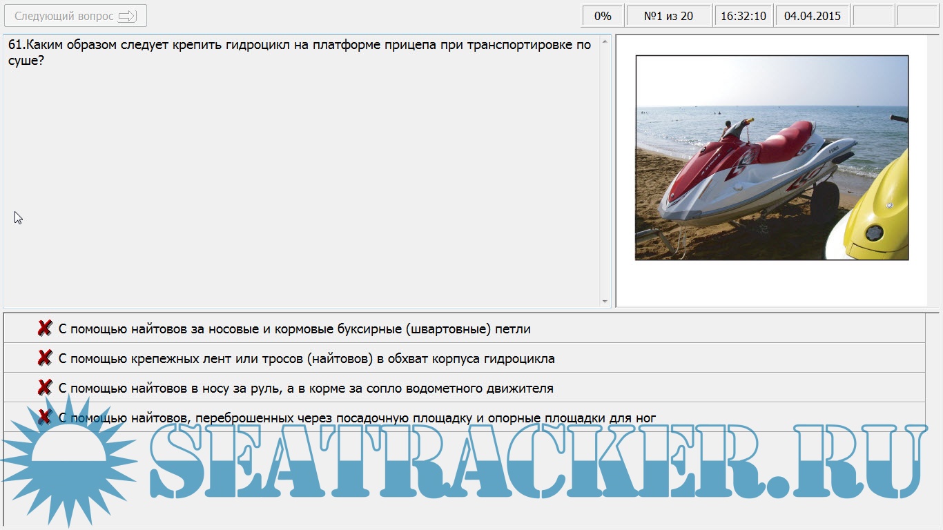 Год выпуска: 2009 Версия: 1.0 Разработчик: Всероссийское общество спасания на водах Платформа: Windows Совместимость с Vista: полная Системные требования: Любой компьютер с Windows 95/Me/XP/Vista/7 Язык интерфейса: только русский Таблэтка: Не требуется Описание: Программа-тренажер для аттестации граждан на право управления: -катерами и моторными лодками на несудоходных внутренних водных объектах (ВП); -катерами и моторными лодками на внутренних водных путях (ВВП); -катерами и моторными лодками во внутренних морских водах, территориальном море и на внутренних водных путях (МП и ВВП); -катерами и моторными лодками во внутренних морских водах, территориальном море (МП); -гидроциклом во внутренних морских водах, территориальном море (МП); -гидроциклом во внутренних морских водах, территориальном море и во внутренних водах (МП,ВВП и ВП); -гидроциклом во внутренних водах (ВВП и ВП); Доп. информация: 100 % программа рабочая и вопросы соответствуют вопросам на экзамене в ГИМС на 2010 год