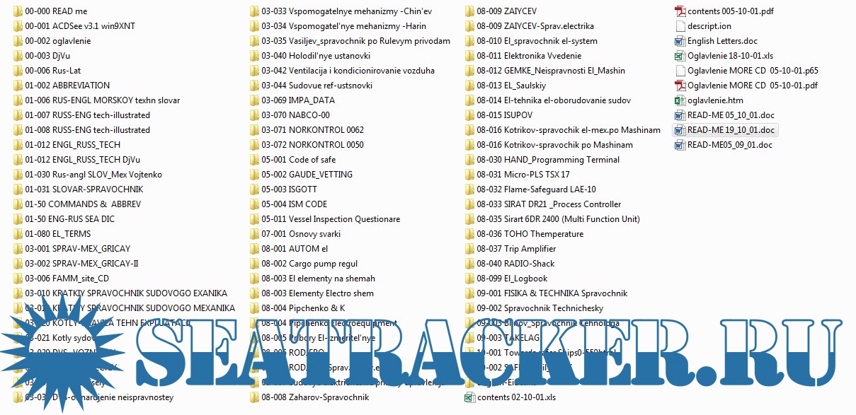 Это список книг (учебников, словарей, технических описаний, справочников и руководящих документов) которые находится в базе данных (CD). Данная литература более всего подходит для судовых инженеров (механиков и электромехаников) и учащихся. Все номера файлов в директориях учебников и др.(кроме словаря) пронумерованы согласно номеров страниц, поэтому для открытия конкретной страницы можно в программе ACDSee(необходимо установить из одноименной директории) просто навести на необходимый номер файла и нажать ENTER.