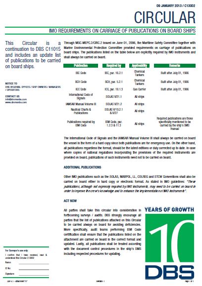 09 January 2013 - This Circular is a continuation to DBS C11015 and includes an update list of publications to be carried out on board.