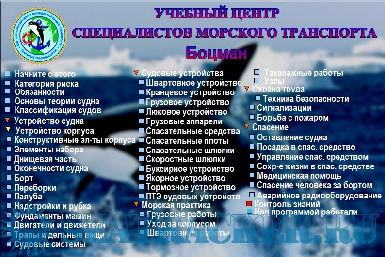 Дает возможность получить и усовершенствовать знания рядового плавсостава, соответствующие должности БОЦМАН. Может использоваться преподавателями специальных дисциплин в режиме проведения лекций, с использованием компьютеров, и слушателями в режиме самоподготовки.