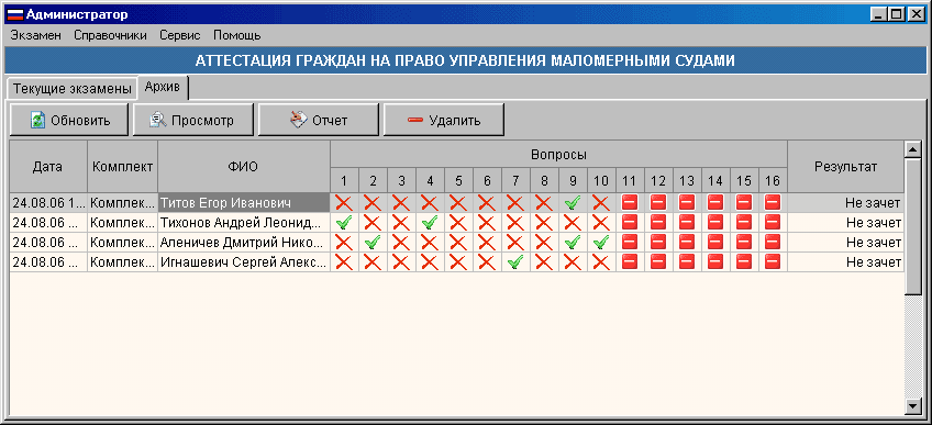 Описание: Программный комплекс (ПК) "Аттестация ГИМС" предназначен для проведения автоматизированной проверки знаний граждан на право управления маломерными судами методом тестирования в строгом соответствии с требованиями Государственной инспекции по маломерным судам МЧС России. ПК "Аттестация ГИМС" введен в эксплутацию соответствии Письмом Начальника Управления Государственной инспекции по маломерным судам МЧС России от 01.09.06 №12/1-8-556.