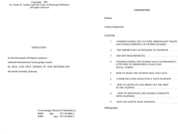 This book is a concise study of Filipino values, etiquette, mores, customs and manners which show differences as well as similarities in behavioral expectations that arise when Masters and officers come to live and work with Filipinos. This book has two intended uses. It is a tool for intercultural relations training aboard ship that, hopefully, will provide a wealth of data for Masters and officers who wish to relate effectively with Filipinos. It is hoped that this book will also be used informally by individuals going to work with Filipinos who will be unable to attend intercultural relations training.