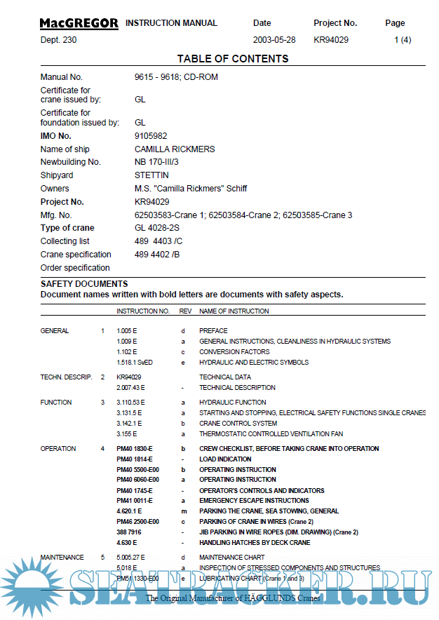 Description: MacGregor Crane Type: GL 4028-2S complete Instruction Manual