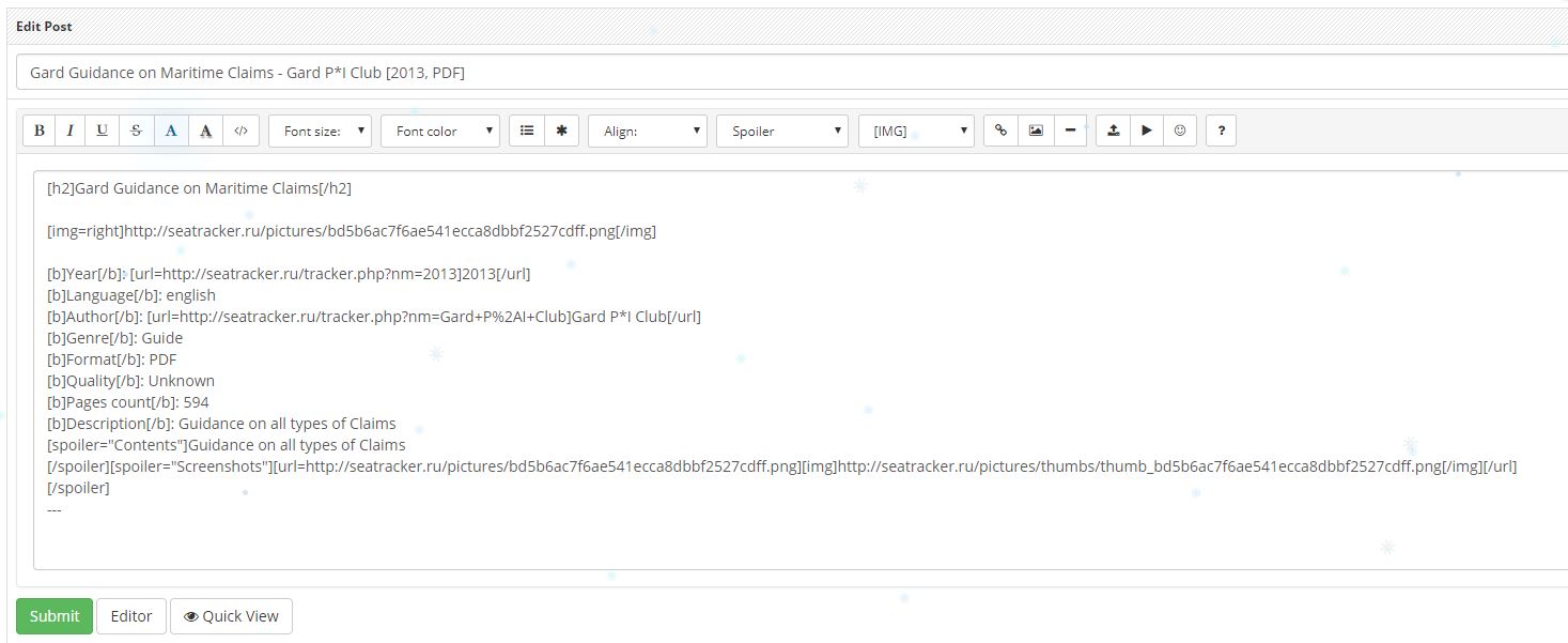 Here you can edit your post and after completing of editing do not forget to push "Submit" button. If you open another one window and will go to image uploading page: https://seatracker.info/gallery.php you may upload one by one screenshots of your release and each time you upload you will see the picture like this: