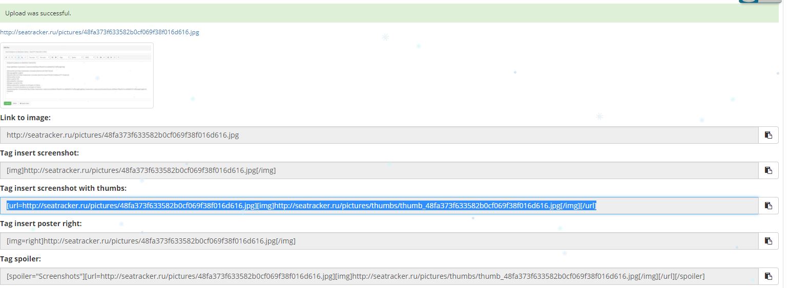 Здесь вы можете редактировать свое сообщение о релизе и после окончания редактирования, не забудьте нажать кнопку "Отправить" Если вы откроете еще одно окно и пройдете на страницу загрузки картинок: https://seatracker.info/gallery.php вы можете загрузить одну за другой картинки скриншотов и каждый раз после загрузки картинок вы будете видеть экран, как ниже: