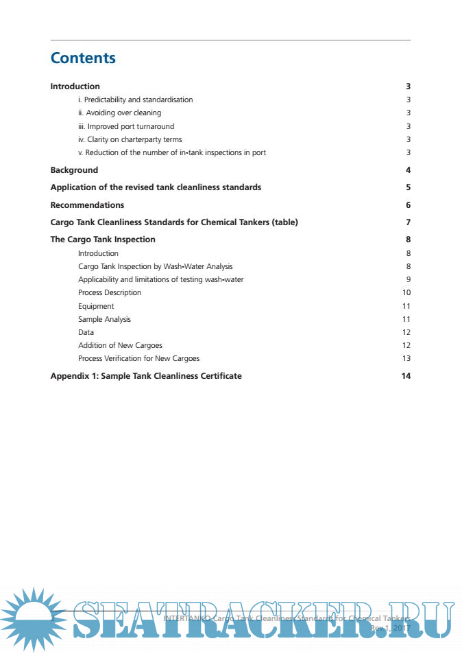 Year: 2017 Language: english Author: Intertanko Genre: Reference book Publisher: Intertanko Edition: Rev.1 Format: PDF Quality: eBook Pages count: 16 Description: The INTERTANKO tank cleanliness standards, first developed and published in 2011, were created to simplify the tank cleanliness verification process as well as to reduce the need for in-tank inspections. The objective was to provide the following benefits: - Predictability and standardisation; - Avoiding over cleaning; - Improved port turnaround; - Clarity on charterparty terms; - Reduction of the number of in-tank inspections in port.