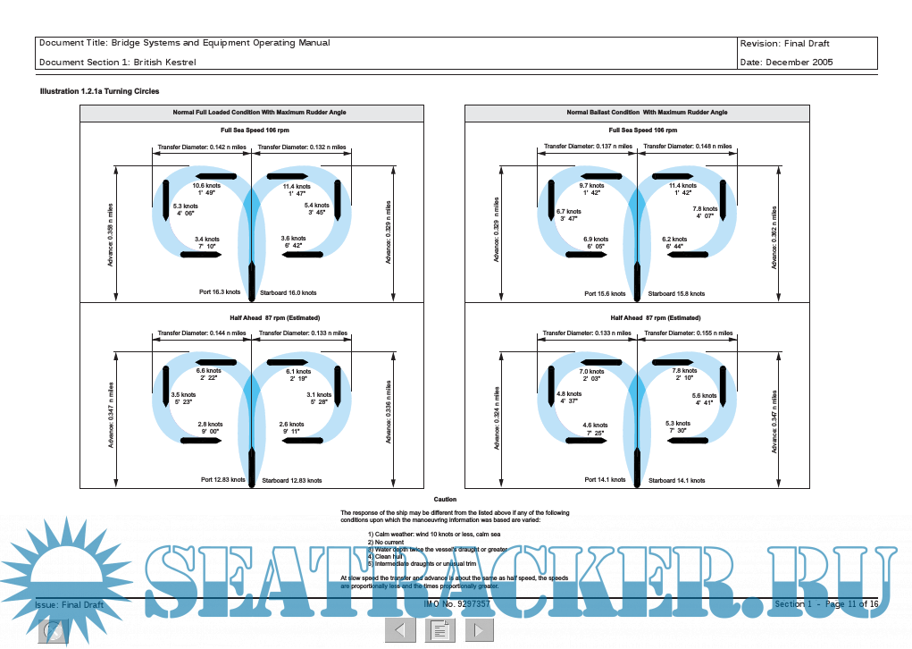 Year: 2005 Language: english Author: Worldwide Marine Technology ltd. Genre: Documentation Format: PDF Quality: eBook Pages count: 286 Description: The purpose of this ‘one-stop’ manual is to assist, inform and guide competent ship’s staff, and trainees in the operation of the systems and equipment on board and to provide additional information that may not be otherwise available. In some cases, the competent ship’s staff and trainees may be initially unfamiliar with this vessel and the information in this manual is intended to accelerate the familiarisation process. It is intended to be used in conjunction with shipyard drawings and manufacturer’s instruction manuals, bulletins, Fleet Regulations, the ship’s Captain’s and Chief Engineer’s Standing Orders and in no way replaces or supersedes these publications, all of which take precedence over this manual. Information relevant to the operation of the British Kestrel has been carefully collated in relation to the systems of the vessel and is presented in three on board volumes consisting of BRIDGE SYSTEMS AND EQUIPMENT OPERATING MANUAL, CARGO OPERATING MANUAL and MACHINERY OPERATING MANUAL. This release contains Bridge Systems and Equipment Operating Manual.