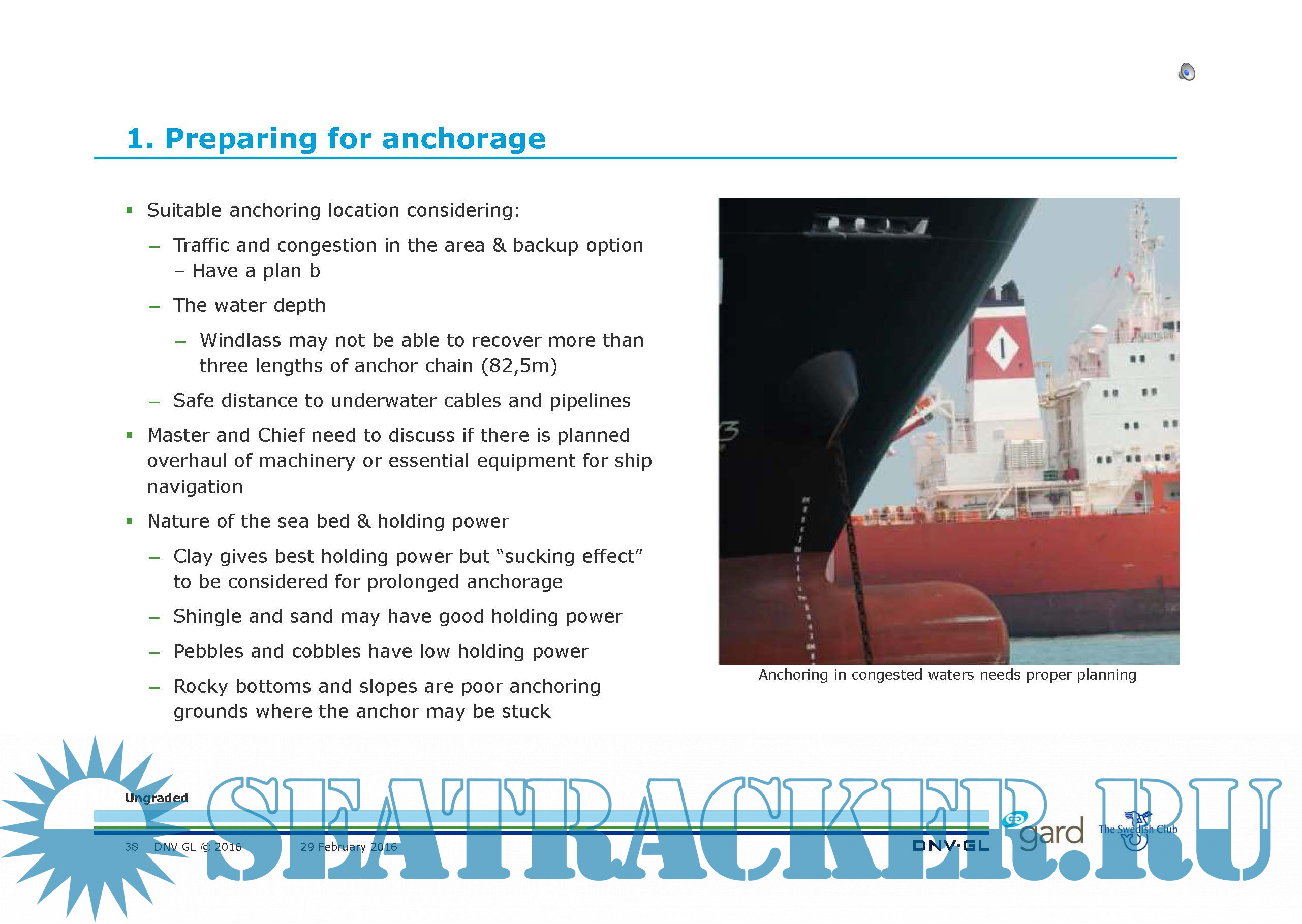 Year: 2016 Language: english Author: DNV GL, Gard and The Swedish Club Genre: Presentation Format: PDF Quality: eBook Pages count: 51 Description: The root cause of many groundings and collisions, lost anchors are among the top five reasons for claims costs. Anchor and chain loss can often lead to collisions and grounding, which can result in additional damage to a vessel. Adding to the costs of anchor loss is the increasingly common requirement from port authorities that lost anchors are recovered. A rising number of anchor losses reported over the last several years prompted DNV GL, Gard and The Swedish Club to investigate this issue. Based on an analysis of damage cases involving anchor and anchor chain losses, the project partners have issued a presentation identifying the most frequent technical and operational causes, and some steps crews and operators can take to address them. This Post consists of 1. DNV TECHNICAL AND REGULATORY NEWS No. 05/2016 - MOST ANCHOR LOSSES ARE AVOIDABLE (2 Pages) 2. Anchor loss - technical and operational challenges and recommendations (49 Pages pdf Presentation)