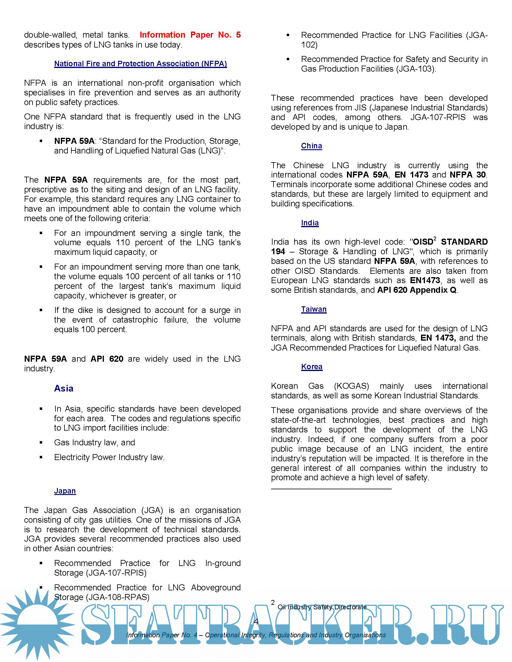 - GIIGNL Information Paper N°4 – Managing LNG Risks – Operational Integrity, Regulations, Codes and Industry Organisations