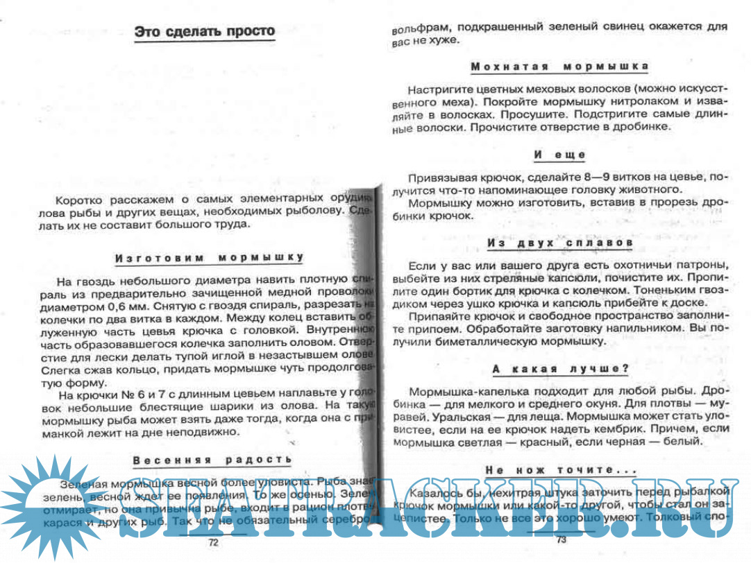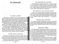 Год выпуска: 1999 Язык: русский Автор: В.Макеев Жанр: Справочное издание Издательство: Терра Спорт ISBN: 5-93127-014-0 Формат: PDF Качество: Отсканированные страницы Количество страниц: 83 Описание: В книге собраны советы опытного рыболова по разным видам летней и зимней рыбалки. По характеру книга является справочником, содержащим емкие советы: как выбрать и оснастить удилище, приготовить насадку и подкормку, где найти естественную наживку и как ее сохранить, где искать и ловить рыбу. В книге содержится более трехсот советов по рыбалке и оборудованию снастей, необходимых и начинающему, и опытному рыболову. Во второй части приведены рецепты приготовления рыбных блюд в домашних и походных условиях.