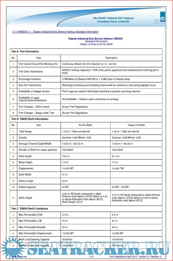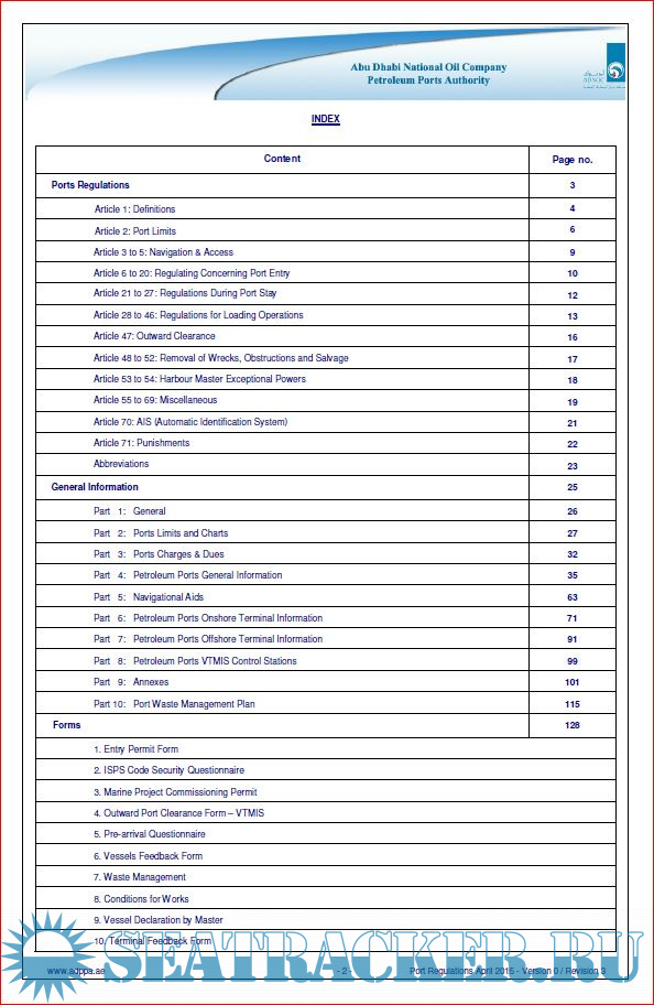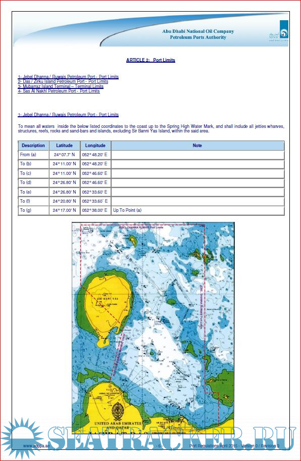 Year: 2015 Language: english Author: ADNOC Genre: Handbook Format: PDF Quality: eBook Pages count: 128 Description: These Regulations are issued in accordance with the Petroleum Ports Law No. 12 of 1973 and the amending Laws No. 1, 3, 34 and 45 issued at Abu Dhabi on 27th February 1980, 28th April 1981, 5th May 1985, and 4th November 2003 respectively. These Regulations shall apply to the Petroleum Ports of Jebel Dhanna, Ruwais, Das, Sas Al-Nakhl and any other Petroleum Port that comes under the Petroleum Ports Authority.