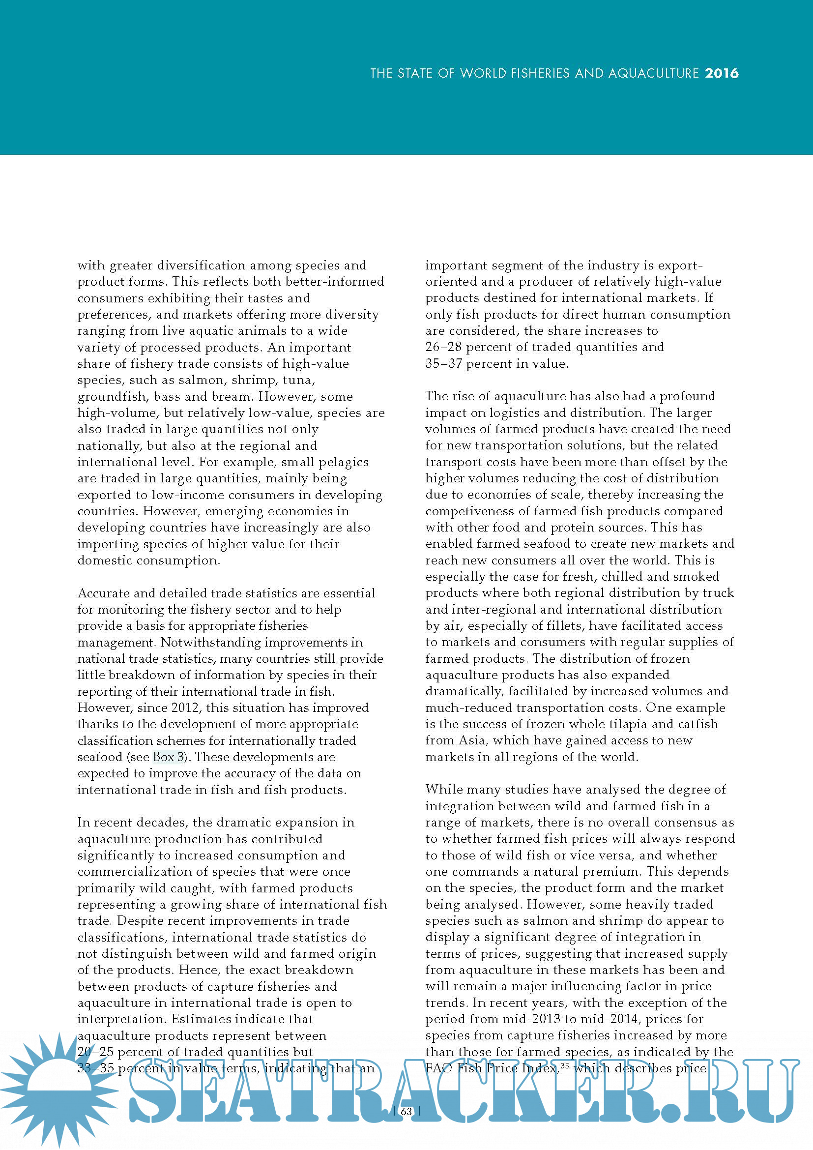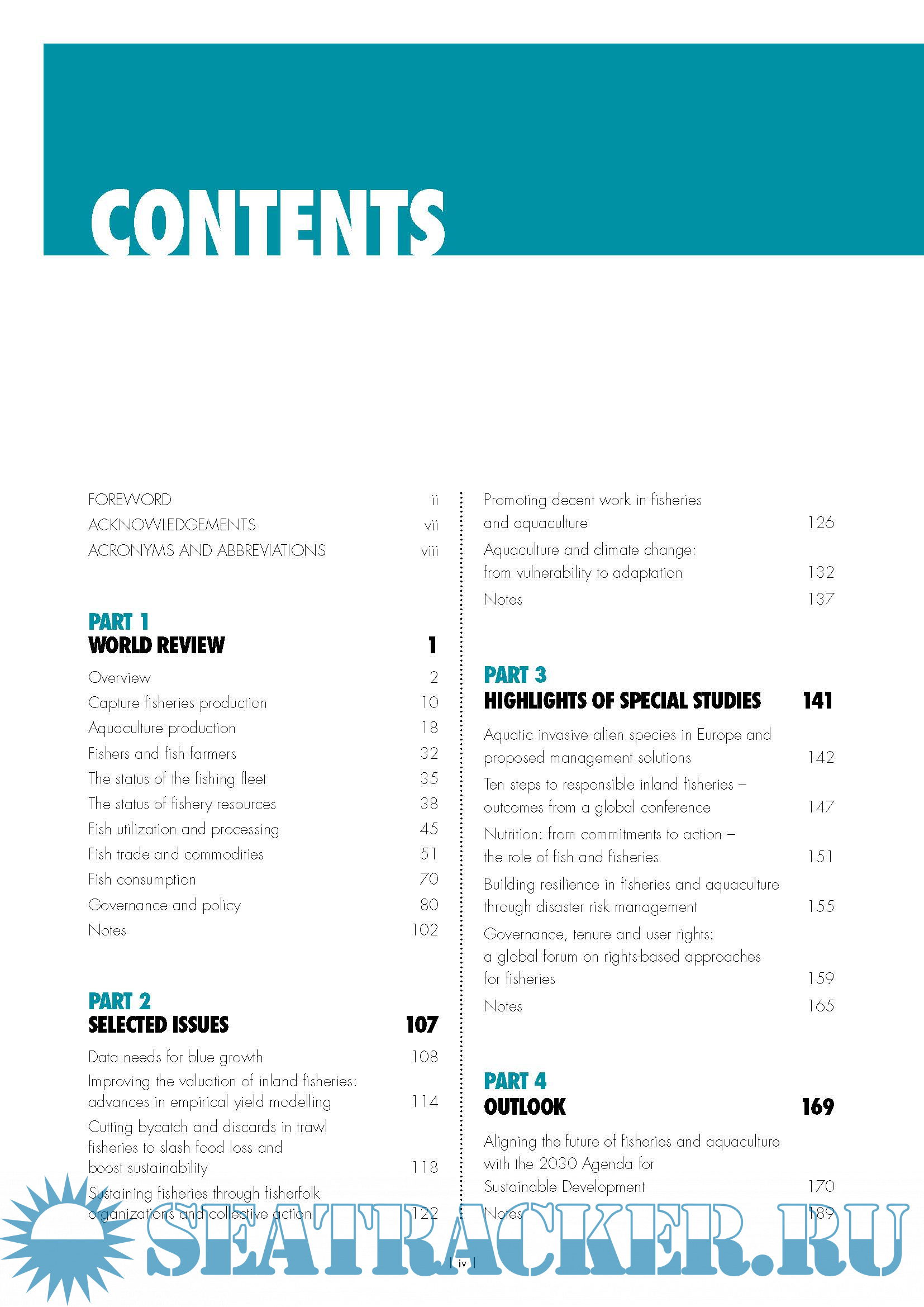 of trends in fish stocks, production, processing, utilization, trade and consumption. It also reports on