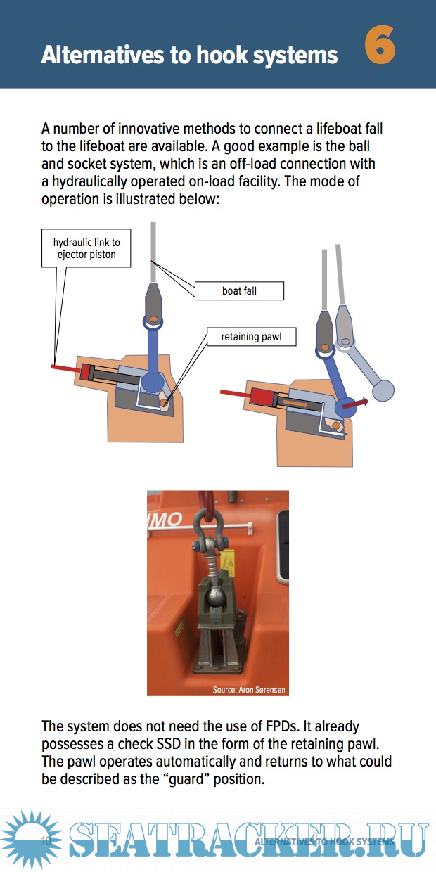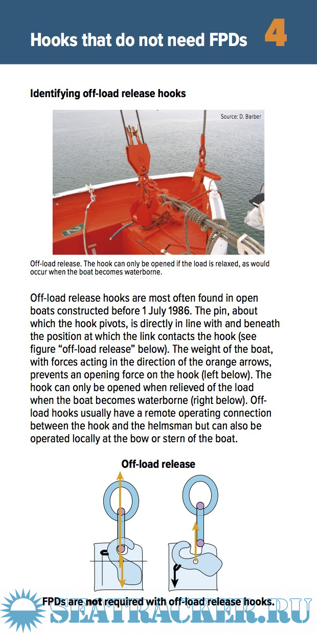 The ‘Avoid Lifeboat Accidents’ pamphlet gives clear guidance on how to prevent accidents with lifeboats and rescue boats equipped with on-load release systems. It advises whether additional precautions in the form of FPDs are appropriate, and if so, when and how to use them safely and effectively when launching and recovering the boat. Other failure devices, and new innovative hook systems are examined too.