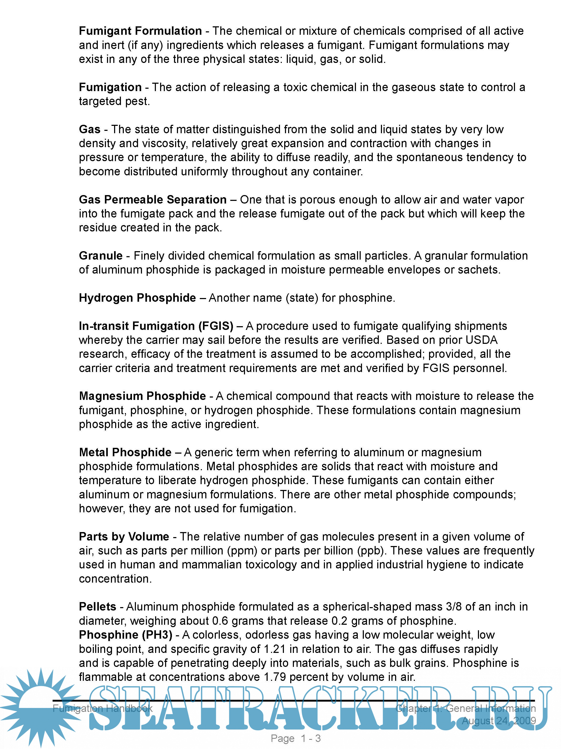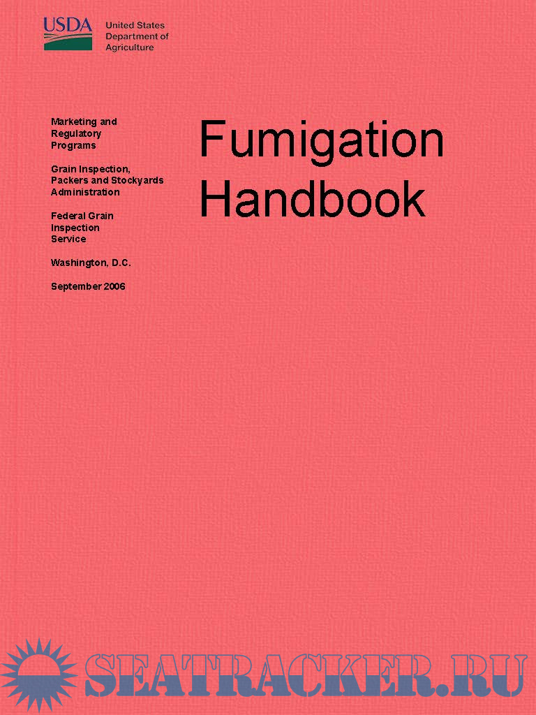 The handbook provides official inspection personnel with basic information regarding fumigants and fumigation procedures. The procedures in this handbook supersede “Fumigation Handbook”, dated September, 1987; Fumigation Handbook, Chapter 3, Land Carrier Fumigation, dated 2/27/90; Fumigation Handbook, Chapter 4, River Barge Fumigation, dated 10/28/93; FGIS-PN-97-14, “Fumigant Label Retention,” dated 5/16/97; FGIS-PN-04-11, “In-transit Fumigation of Shipholds with Separations,” dated 4/19/04; and FGIS-PN-05-02, “Short Voyage Ship Fumigation Procedures,” dated 1/07/05.