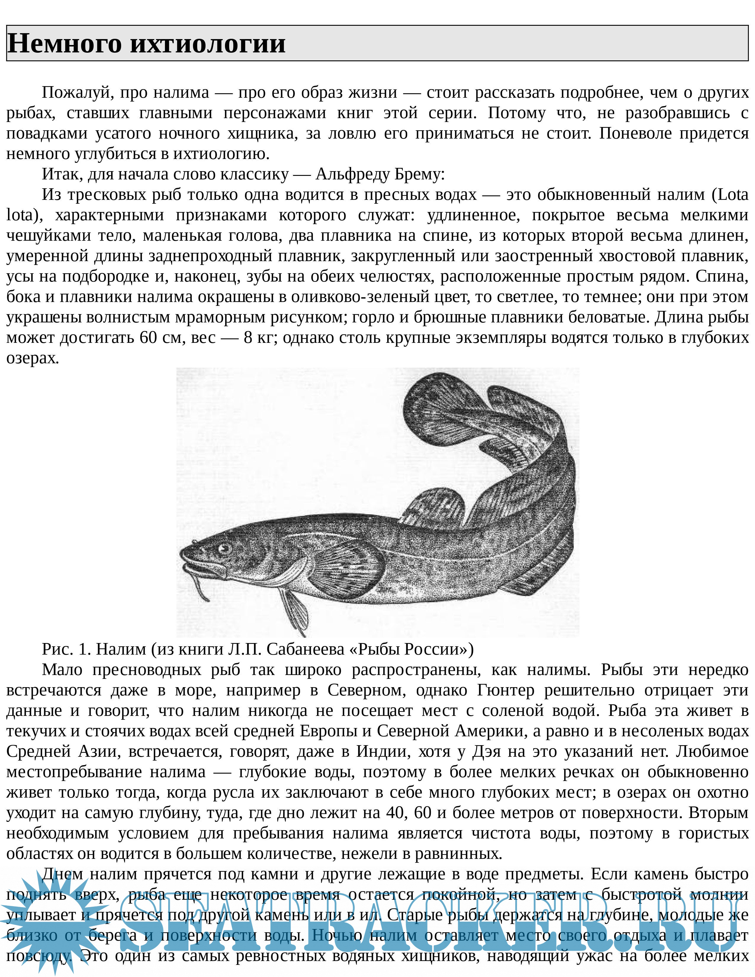 Наряду с известными удочками, донками и подпусками описаны применяемые для ловли налима сетные и другие рыболовные орудия, не относящиеся к спортивным. Способы и снасти, разрешенные или разрешенные с ограничениями современным законодательством, описаны подробно, безусловно запрещенные — кратко, в качестве исторического экскурса.