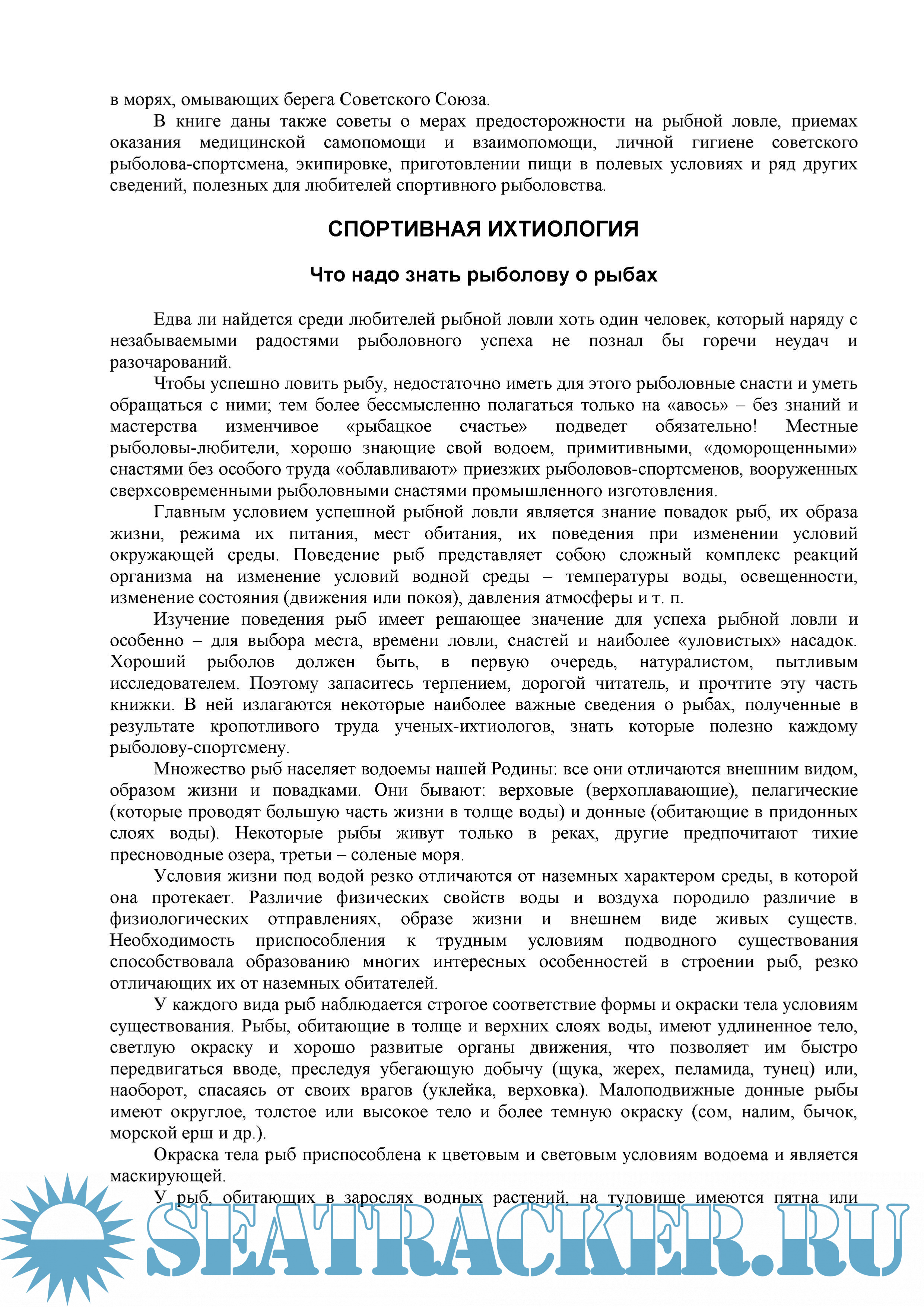 ПРЕДИСЛОВИЕ. СПОРТИВНАЯ ИХТИОЛОГИЯ. РЫБНАЯ ЛОВЛЯ В РЕКАХ И ОЗЕРАХ. СПОРТИВНАЯ РЫБНАЯ ЛОВЛЯ НА МОРЕ. ПОГОДА И РЫБНАЯ ЛОВЛЯ. НЕОТЛОЖНАЯ ПОМОЩЬ НА РЫБАЛКЕ. НОЧЛЕГ НА БЕРЕГУ. РЫБАЦКАЯ КУХНЯ. КАК ОРГАНИЗОВАТЬ СЕКЦИЮ СПОРТИВНОГО РЫБОЛОВСТВА. БЕРЕГИТЕ РЫБНЫЕ БОГАТСТВА НАШЕЙ РОДИНЫ. ПОСЛЕСЛОВИЕ. ПРИЛОЖЕНИЕ.