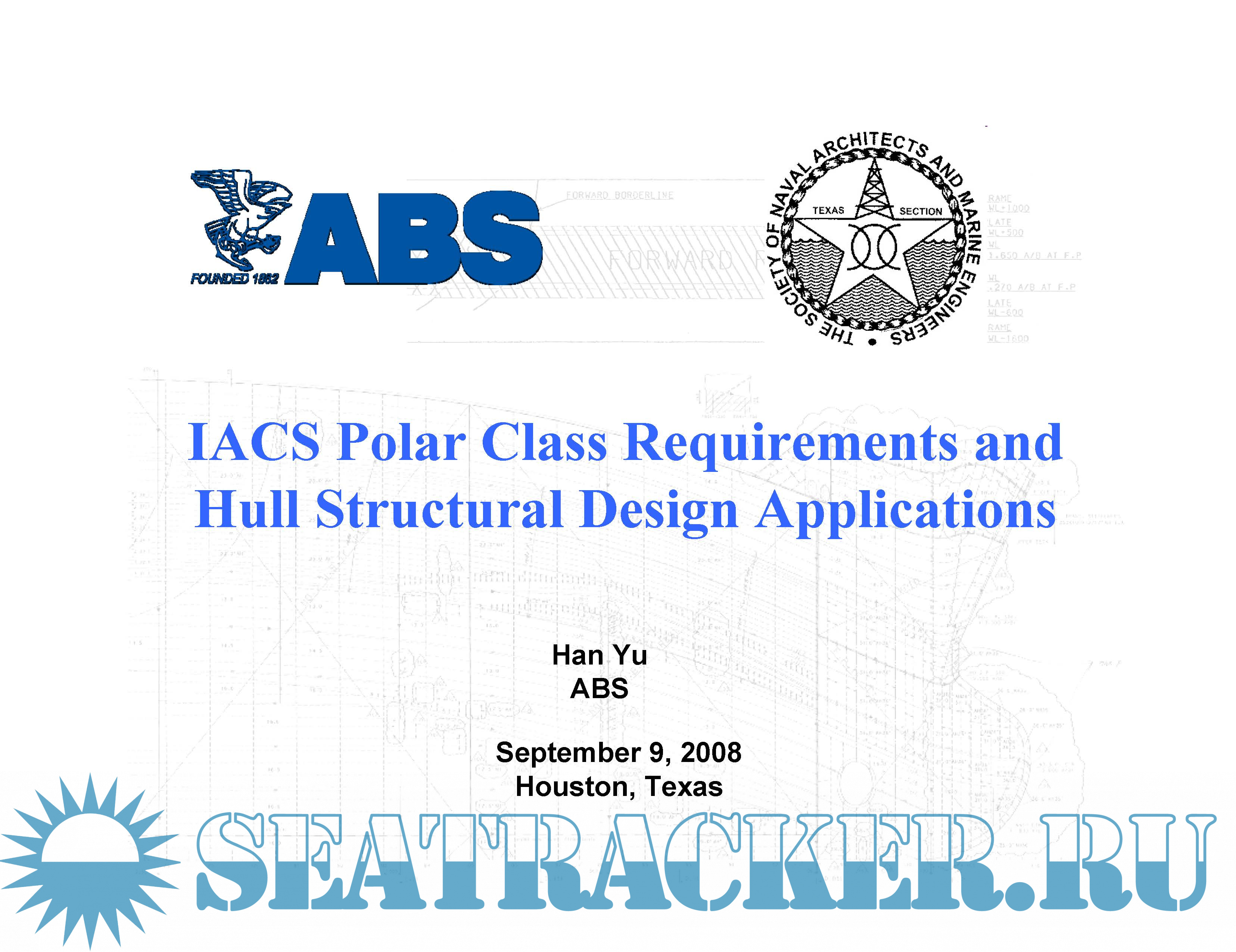 Description: On Sept. 9, 2008, SNAME Texas Section held its regular 2nd Tuesday of the month Luncheon Seminar. Dr. Han Yu who is currently a Manager, Corporate Technology for ABS, gave this presentation. The International Association of Classification Societies (IACS) has adopted unified requirements concerning Polar Class vessels in March 2008. This presentation provided an overview of the IACS Polar Class rules and details of ice strengthening requirements. Some background information was presented to help users to better understand the limitations and proper application of Polar Class requirements.