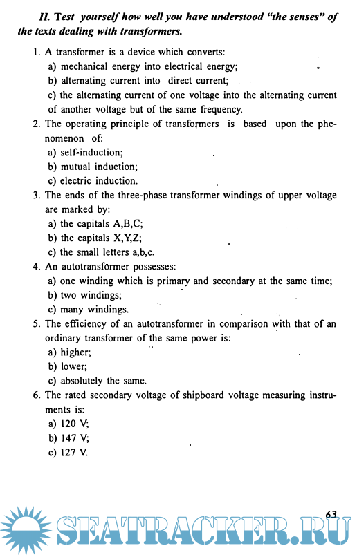Описание: Настоящее учебное пособие имеет своей целью обучение специ­альному английскому морскому языку в области электротехники и предназначено как для студентов старших курсов энергетических фа­культетов высших мореходных учебных заведений и для судовых электромехаников и механиков, желающих усовершенствовать свои зна­ния в области профессионального морского английского языка.