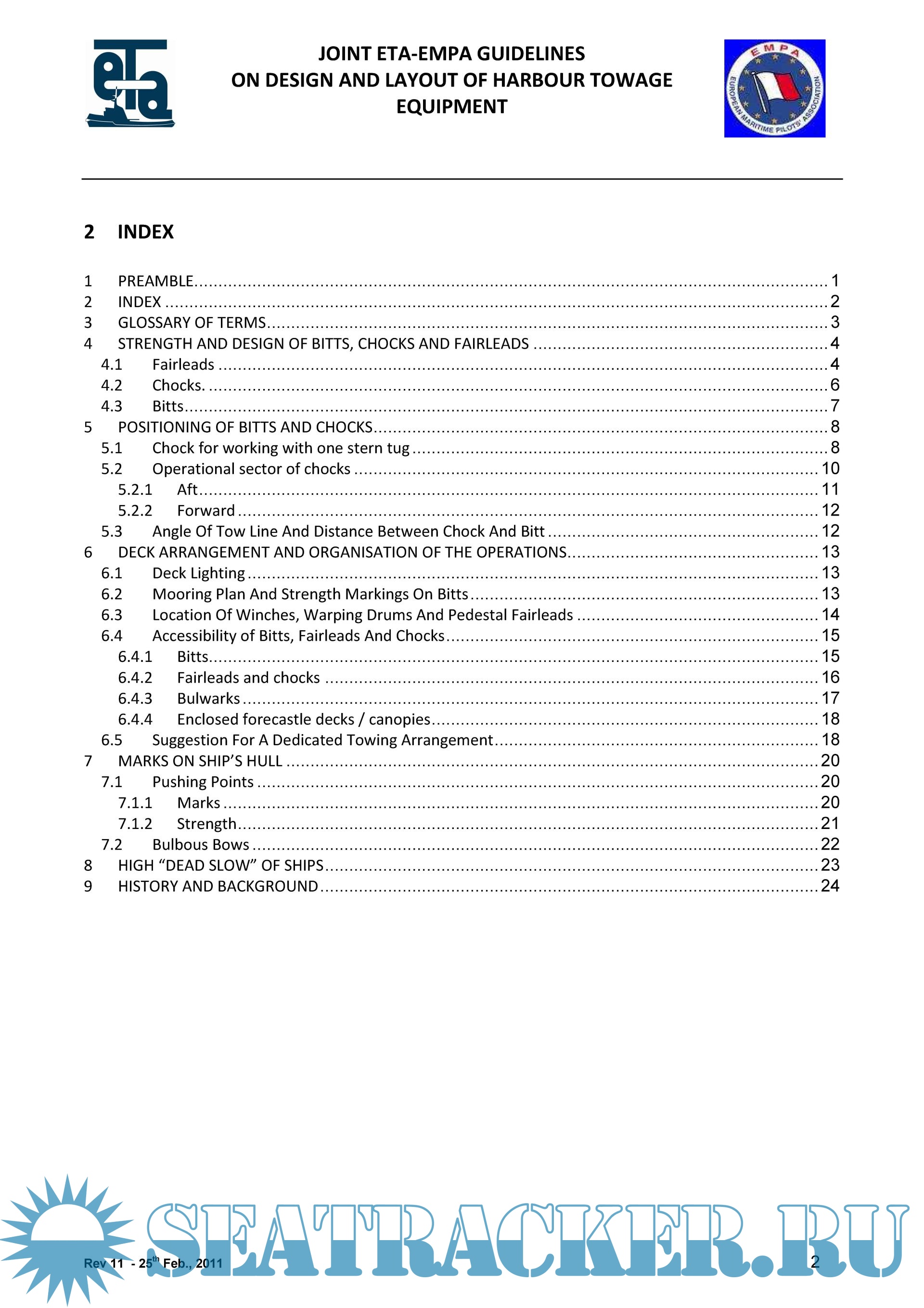 Year: 2011 Language: english Author: ETA/EMPA Working Group Genre: Guide Publisher: ETA/EMPA Working Group Format: PDF Quality: eBook Pages count: 26 Description: Over the last decade, European pilots and tug operators have increasingly experienced operational problems when handling ever-larger ships. The problems are mainly related to the type and/or strength and/or positioning of deck equipment on board of ships. This document is intended to raise the awareness of owners, insurers, naval architects, new-building superintendents, classification societies and shipyards about specific areas of concern to the towage industry, in order to encourage them to take these into account when ordering or designing vessels. The purpose is to assist the parties involved to ensure that the deck layout will result in safer operations for both ships and tug crews, yet deliver rapid and more efficient harbour towage operations.