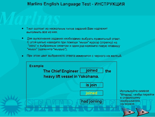 Тест на знание английского языка для плавсостава. Количество запусков не ограничено. Программа широко используется иногда в крюнинговых компаниях. Если вам не нужна аттестация плавсостава по специальностям на английском языке, а только проверка грамматики английского языка для плавсостава, то эта программа для Вас.