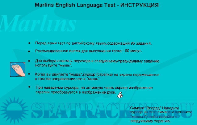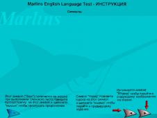 Какие-либо картинки к вопросам отсутствуют. Просмотреть правильные или неправильные ответы невозможно. Можно только увидеть общий результат теста в %, по таким параметрам в % как: Listening , Reading , General. Требования в Компаниях - не менее 65% общий результат прохождения аттестации. Но в Лондонском "Зодиаке" не менее 90%. тестирование проводится в "обучающем" (когда пользователю автоматически предлагается правильный ответ) и "экзаменационном" режимах. Результаты тестирования фиксируются в виде отчетов, которые далее предлагается распечатать на принтере. На основании полученных результатов программа дает рекомендации по изучению того или иного раздела Marlins Progress Test. отличное пособие для самопроверки.