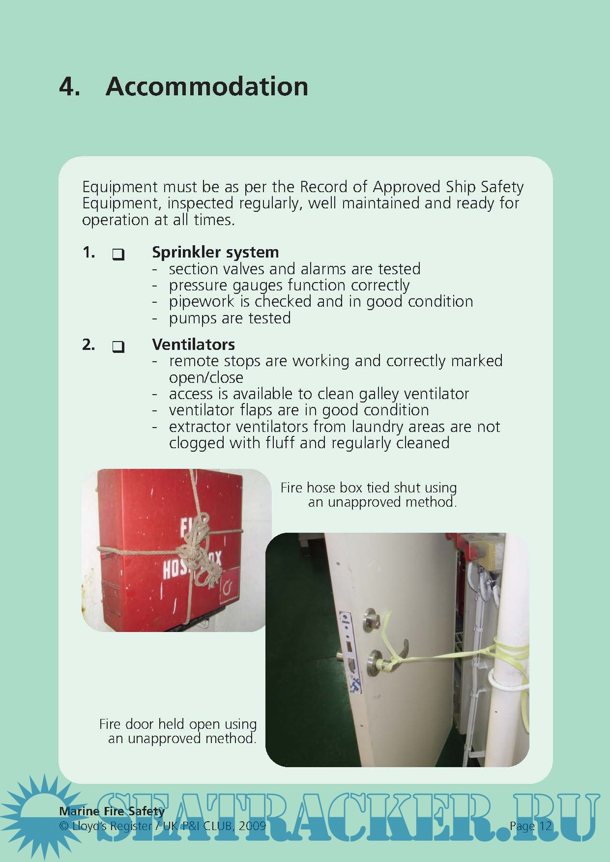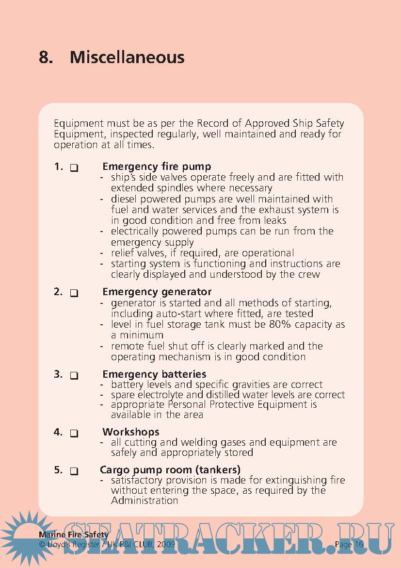 Year: 2009 Language: english Author: Lloyd's & UK P&I Club Genre: Methodological guide Format: PDF Quality: eBook Pages count: 18 Description: During the period 2006-2008, 1216 people were reported killed or missing as a result of 465 incidents of fire and explosions on board merchant seagoing ships of 100 gt and above. 988 of these deaths were from a single incident. It is essential that crew are appropriately trained to inspect, maintain and operate equipment and that the equipment is ready for use at all times. Being prepared can mean the difference between lives lost or lives saved. In conjunction with an industry partner, the UK P&I Club, we have analysed data relating to fire safety, including deficiencies found by Port State Control officers. The result is this re-usable checklist, which highlights the most common deficiencies and lists them by distinct areas of the ship. This means that each crew member can take responsibility for his or her own area.