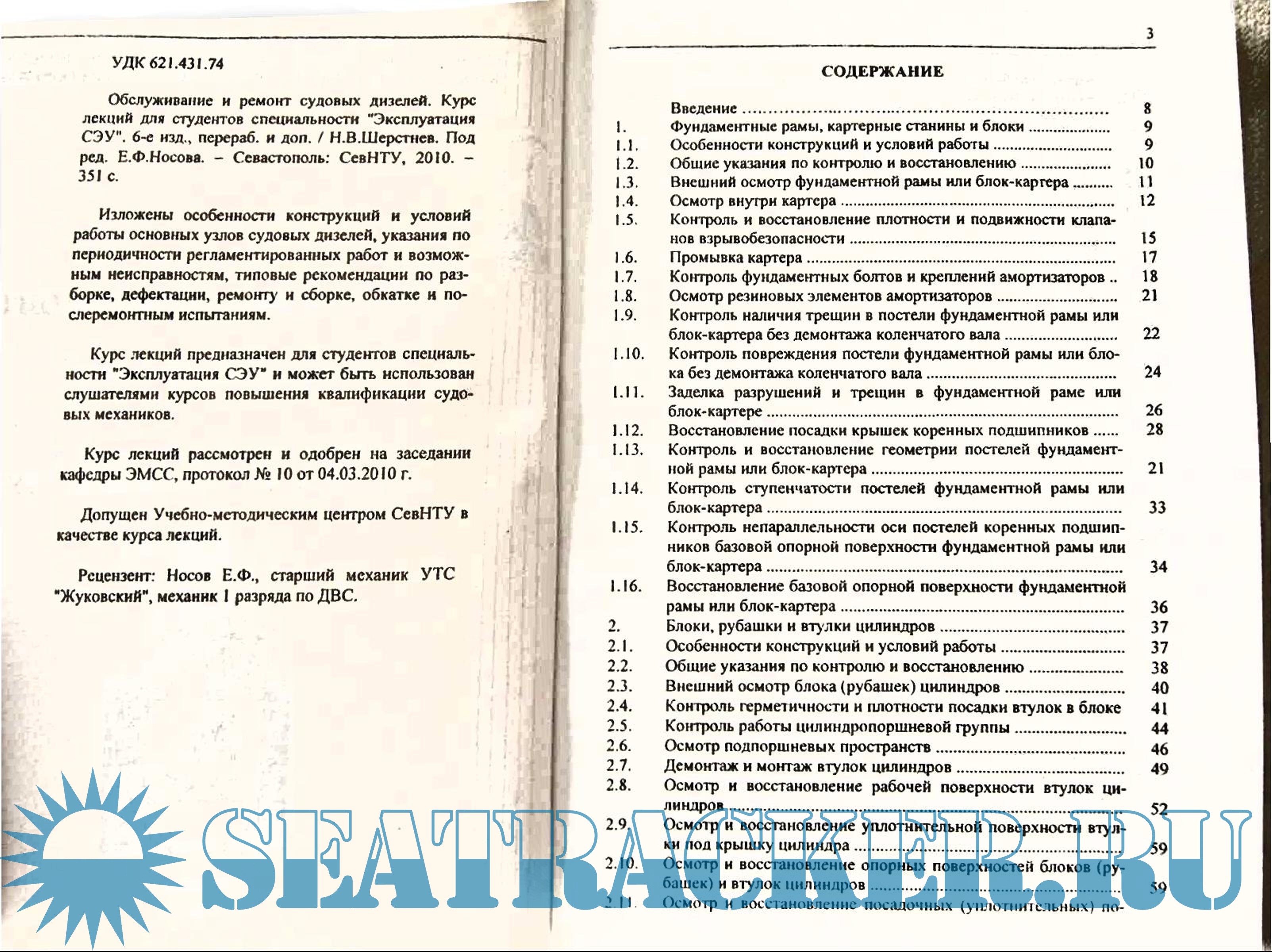 Год выпуска: 2010 Язык: русский Автор: Шерстнев Н.В. Жанр: Курс лекций Издательство: СевНТУ Издание: 6-е Формат: PDF Качество: Сфотографированные страницы Количество страниц: 351 Описание: Курс лекций по обслуживание и ремонту судовых двигателей для студентов по специальности ЭКСПЛУАТАЦИЯ СЭУ Доп. информация: Была перефотографированна в 2010 в ходе обучения на моториста. Довольно информативная книга. Случайно нашлась на жестком диске. Возможно будет кому-то полезной.