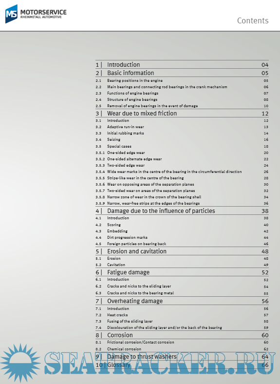 Year: 2017 Language: english Author: MS MotorService International GmbH Genre: Manual Publisher: MS MotorService International GmbH Edition: 01st 05.2017 Format: PDF Quality: eBook Pages count: 72 Description: This brochure provides an overview of the different types of damage in engine half shell bearings and thrust washers. It also supports experts with diagnostics and determining the cause of damage. The process of assessing engine damage always requires an all-encompassing approach to identify the causes, which may not always be clear. Following engine repair, failures may often occur again. This is because damaged components may have been replaced, but the cause of damage has not been rectified.