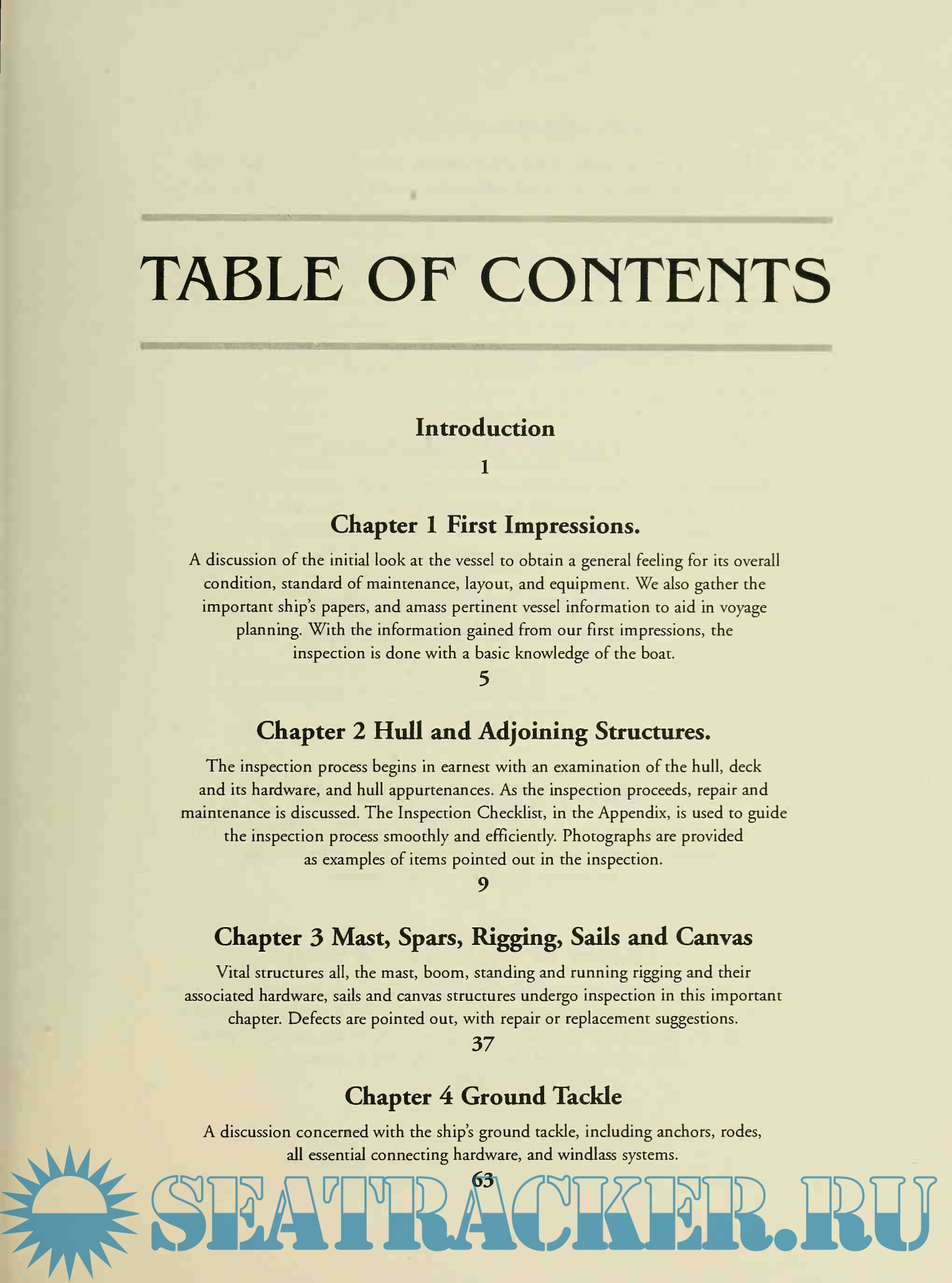 Year: 2007 Language: english Author: Mapes E. Genre: Guide Publisher: Offshore Publications ISBN: 0977777200 Format: PDF Quality: Scanned pages Pages count: 246 Description: It was my fate, in the fall of 1988, to meet a gentleman at a boat show in Harrison Township, Michigan. While showing me around his boat, he mentioned that he needed a hand in sailing her to the Caribbean to join the charter fleet. In that instant my sailing world began its expansion past cruising, racing, and delivery on the Great Lakes. Three weeks later, we were on the Detroit River in Enchantress, bound for Lake Erie and the Atlantic Ocean beyond. Leaving New York Harbor and the Ambrose Light was a momentous event. The anticipation of new adventures left me wondering what was out there, and whether or not I could handle it. Little did I know that just ahead were three days of Force 8 cold front winds and the accompanying 30-foot waves as the Gulf Stream collided head on with those northerly winds.There would be no meals, little sleep, and seemingly unending seasickness. Waves hissed as they lifted us to their crests, roaring as they swept past. The bow sliced through the dark water and threw spume aft toward the cockpit. Whipping through the rigging, the gale produced a crescendo of sound, forcing us to shout to be heard over the roar. When the breakers approached from astern, there were only seconds to duck and hold on as warm Gulf Stream water deluged the cockpit. The lightweight autopilot could withstand only a few hours of the punishment, so we took our turns at the helm. What had I gotten myself into? This was my introduction to offshore passagemaking. But what I discovered during those days on the edge was something unexpected. I found that once I got past the noise and cold, the nausea and the fear, the ocean was astoundingly beautiftil. Our perch on the crests of those towering waves provided a panoramic view of the vast blue sea with its highlights of white foam. The night sky was full of more twinkling stars than I ever dreamed existed, and the waves' shimmering phosphorescence reminded me of snow-covered landscapes on a bright winter's day. My senses were delighted by flying fish, dolphins, whales, and that wonderful watery roar as our bow carved through the water right on course for Bermuda. The immense power and benevolence of Nature were on full display. I discovered that our well-found yacht, properly maintained and stocked with the right gear, lent a calming sense of confidence and security. This reassurance allowed us to become more comfortable with the storm, certain that the boat could withstand whatever she had to. That unforgettable passage and the lessons it taught me became a basis for the inspecdon and preparation of every boat I sail. If a vessel is truly ready, she will deliver us.