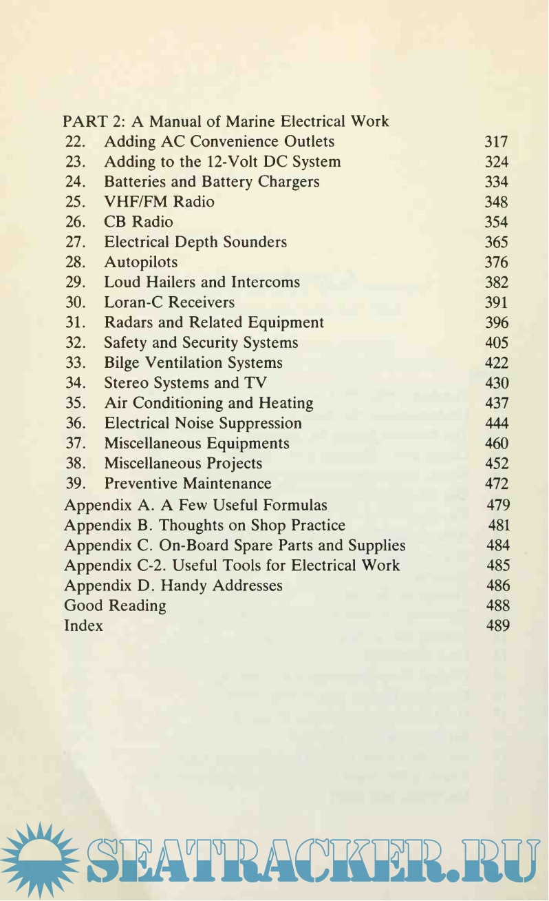 Added in this new edition (Part 2) are such related topics as electronic equipment selection, installation and maintenance; advances in marine storage batteries and charging circuits; additional shop practices; and "hints and kinks" of boat electrical/electronic work.