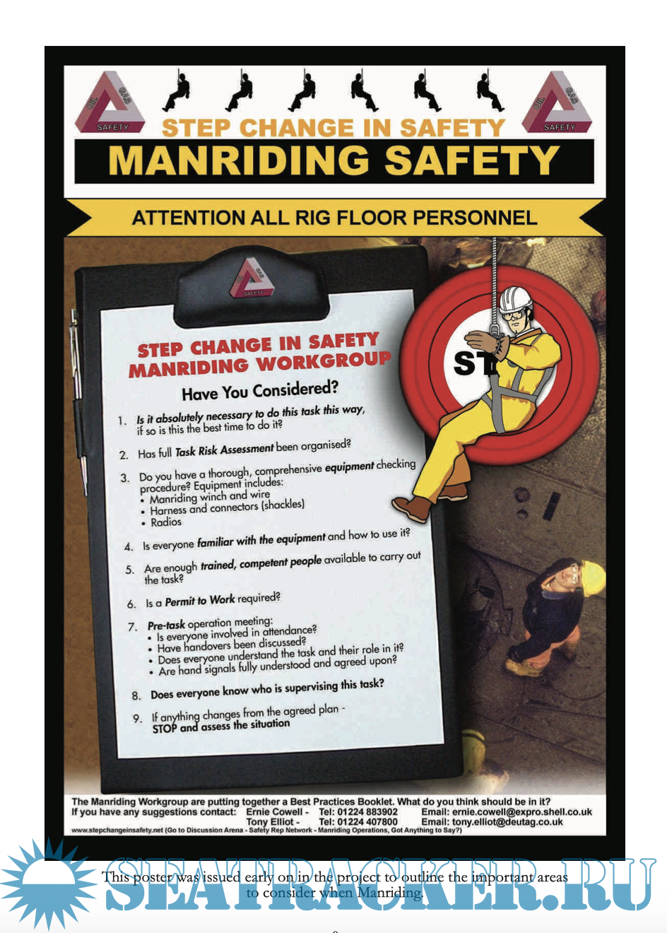 Description: In an effort to reduce accidents associated with manriding operations, in January 2001 the STEP CHANGE IN SAFETY Manriding Safety Workgroup was formed. The objective was to publish current best practice information for manriding in derricks, masts and moonpools in one document.